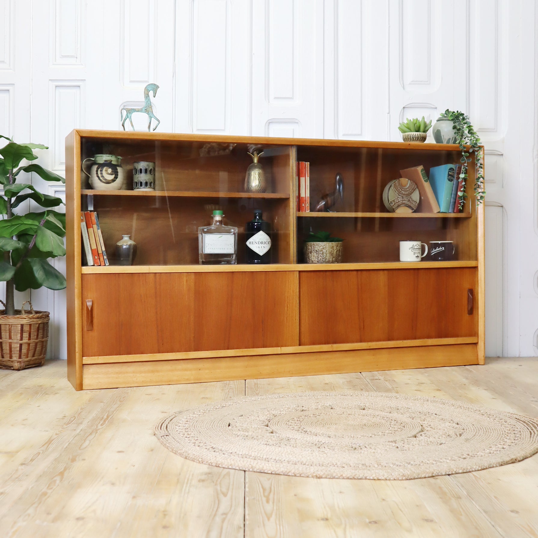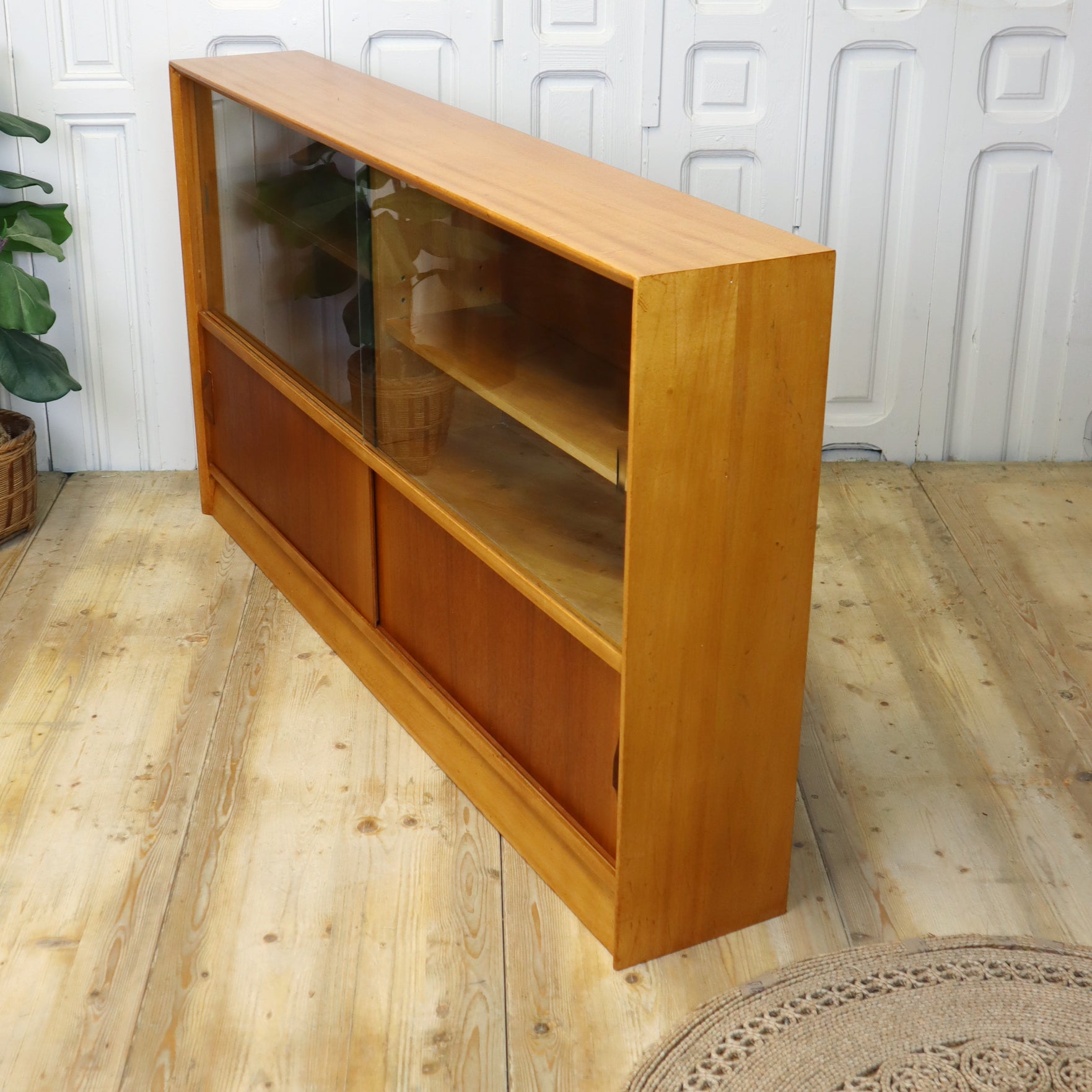 Featuring sliding glass doors to the top section, sliding teak doors to the lower and adjustable shelves offering plenty of room for displaying your favourite pieces. Currently very desirable and very functional.