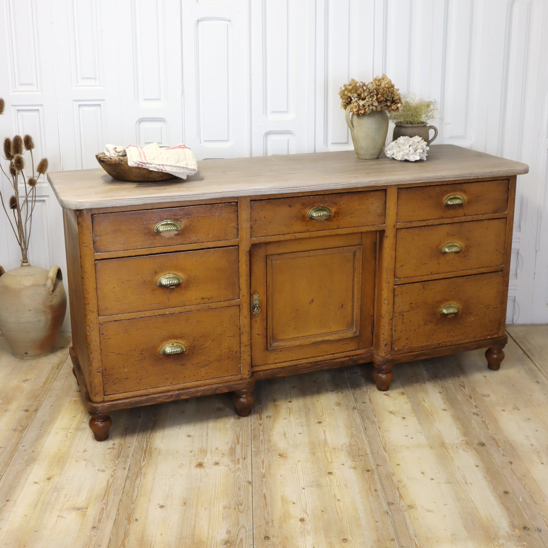Authentic original paint finish, with a wonderful patina, the dresser has its original scrub top and accompanying hutch top, featuring multiple drawers and a central cupboard with original brass cup handles.