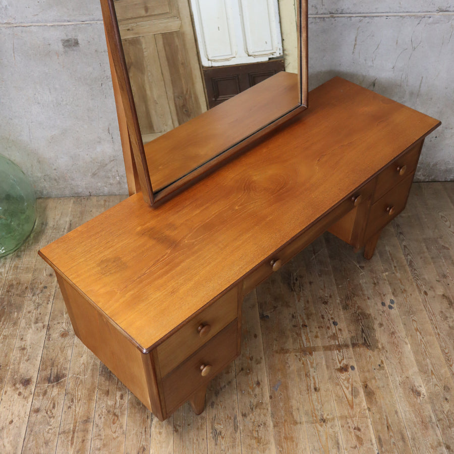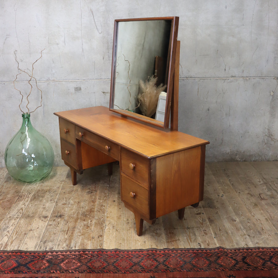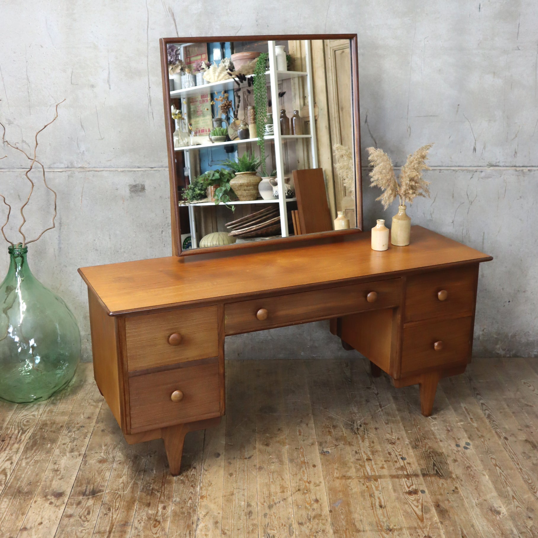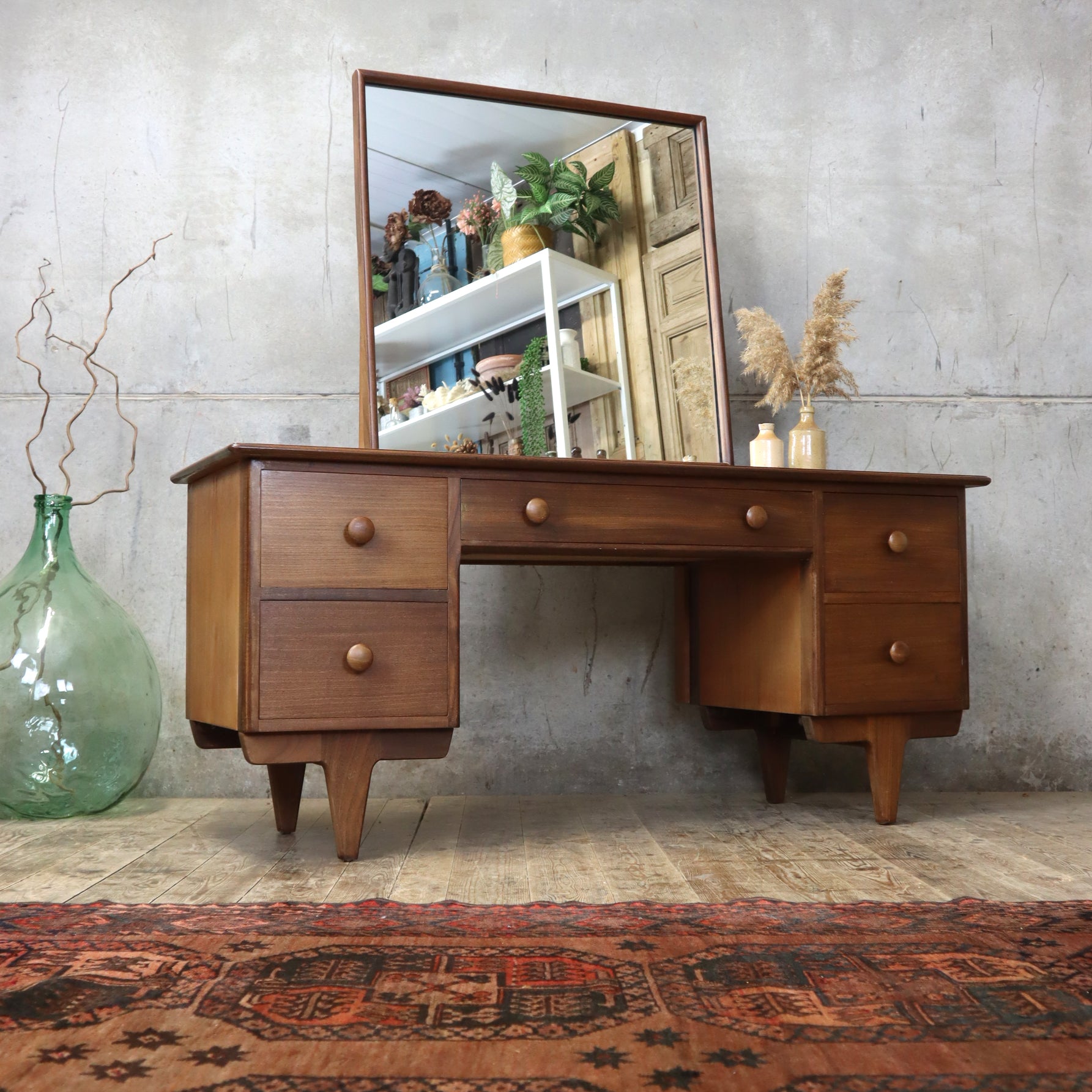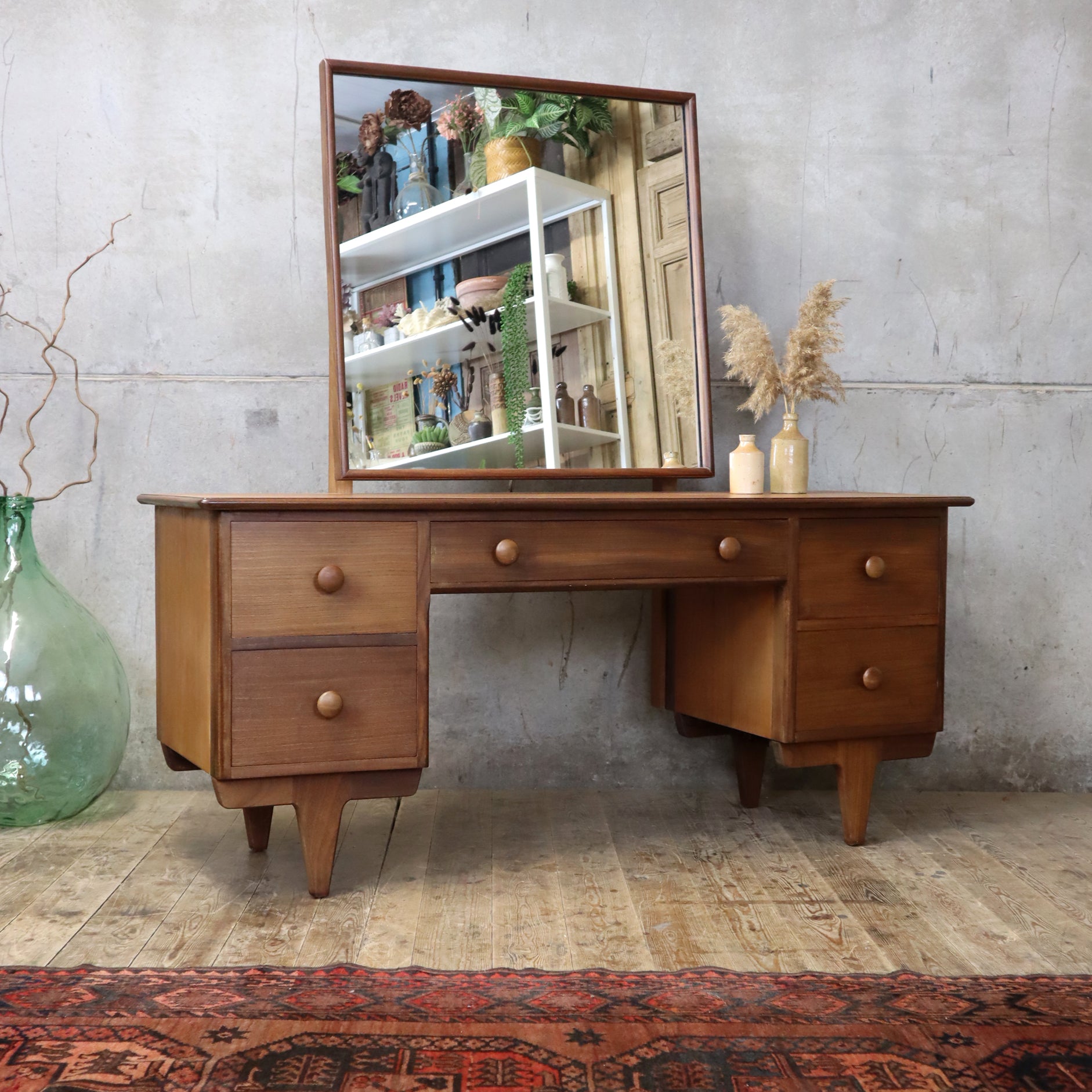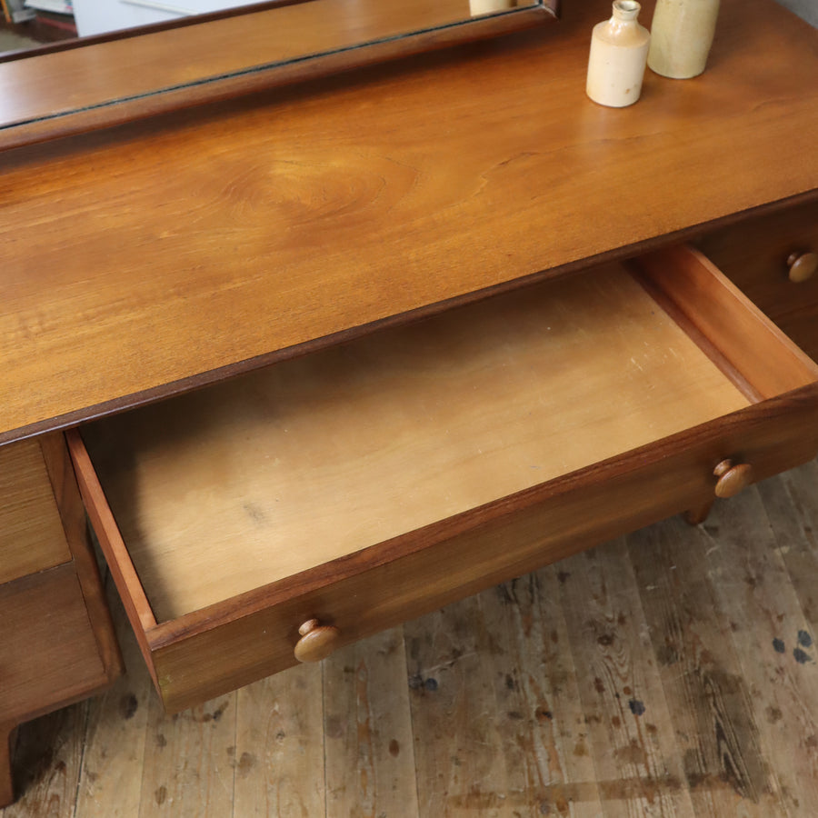 Simplistic design with a lovely drawer configuration, the piece is constructed from solid Afromosia, incredibly well made. Comes complete with large adjustable mirror. The mirror can be easily removed if desired.