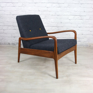 A stunning chair featuring solid teak swooping arms, solid teak tapering legs and gorgeous brand new charcoal upholstery with contrasting buttons.
