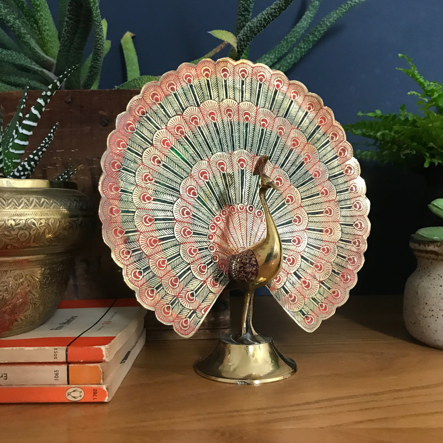 A stunning brass peacock ornament with beautiful coloured engraving work - just look at those tail feathers and how they catch the light!