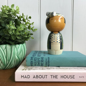 A stunning and rare 'Lucky boy' Kokeshi doll from Japan - hand turned and hand-painted. We love the proud expression on this dolls face, and the beautiful outfit with matching colours and patterns!