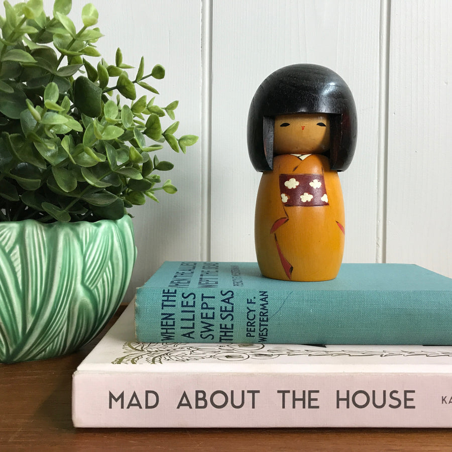 A stunning Kokeshi Doll from Japan - hand turned and hand-painted in a striking yellow/orange colour kimono, right up our street!