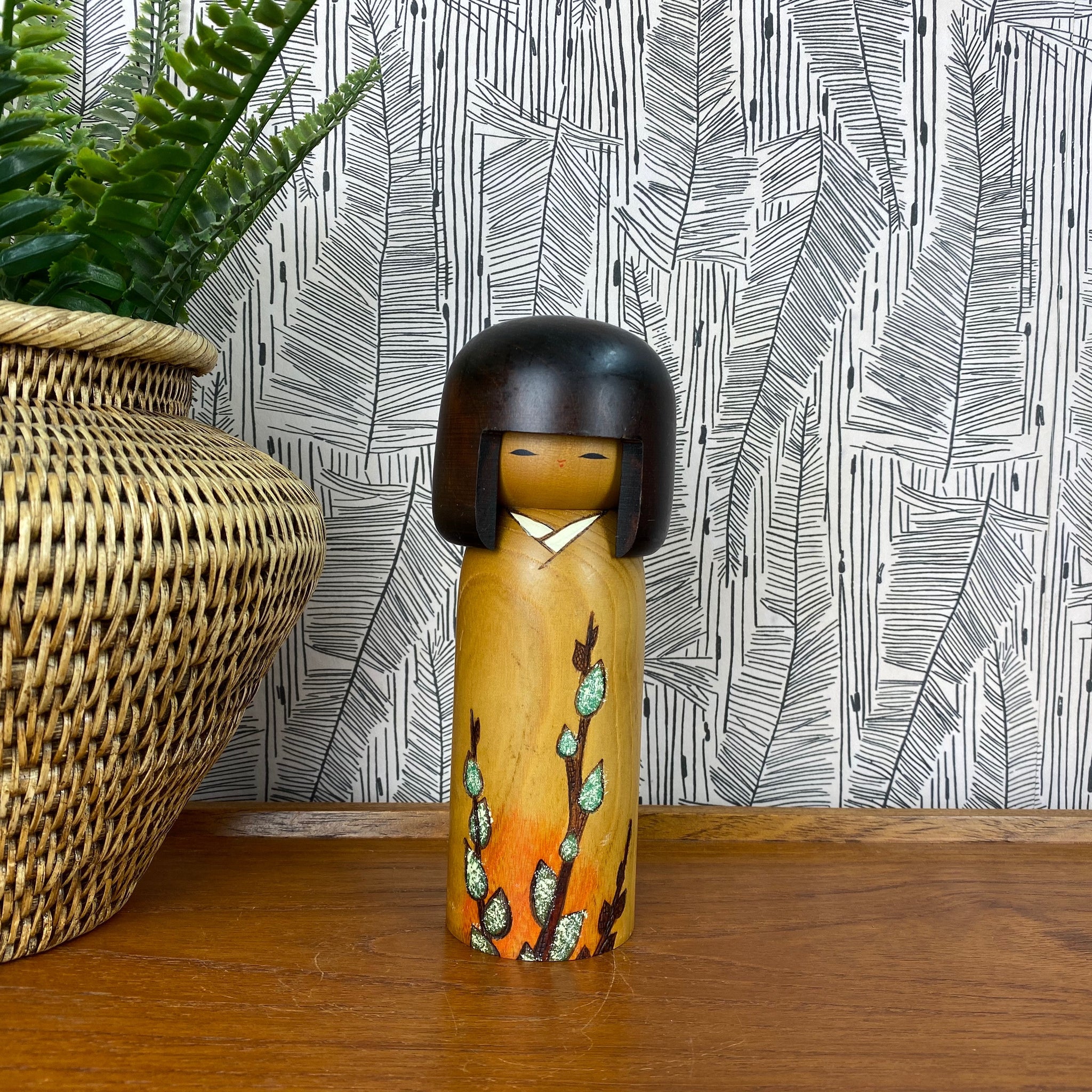 A stunning Kokeshi Doll from Japan - hand turned and hand-painted with a beautiful pattern of branches with blossom buds. We particularly love the warm sunrise featuring in the distance.