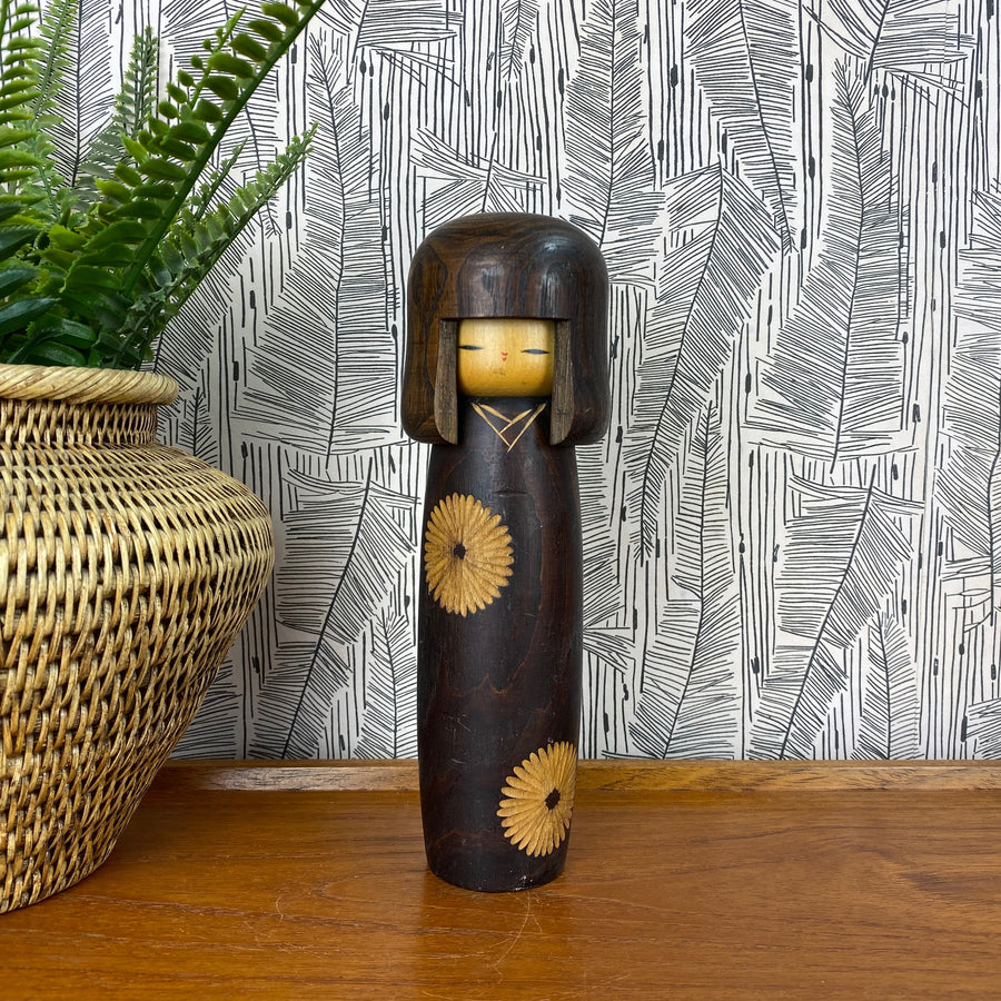 A stunning Kokeshi Doll from Japan, and a good size too! Hand turned and hand-painted with a striking pattern. We particularly love the patina of the dark wood and contrasting pattern used on this piece.