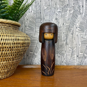 A stunning Kokeshi Doll from Japan - hand turned and hand-painted with beautiful contrasting pattern detailing. We particularly love the dark rich grain in the wood on this piece.