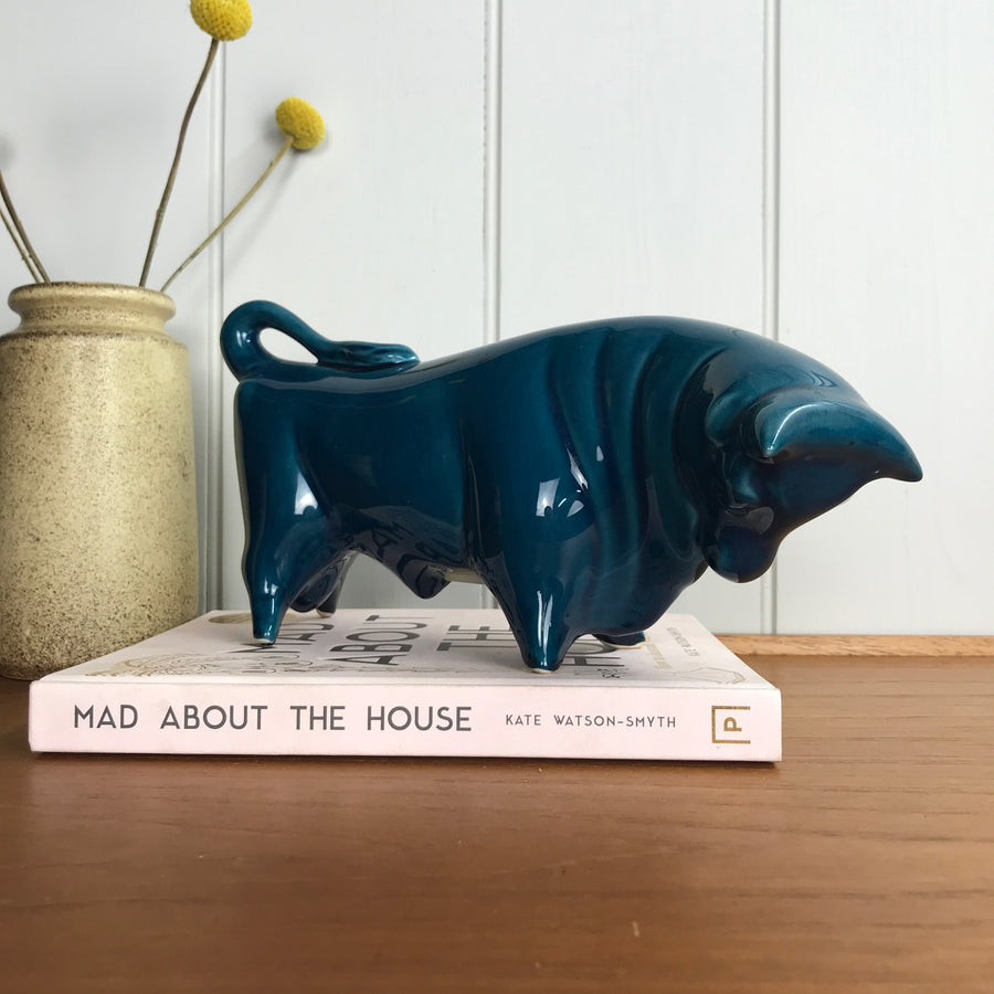 A stunning large Mid Century ceramic bull in a beautiful rich teal blue designed by Colin Melbourne for Trentham Art Pottery in the 1950s.
