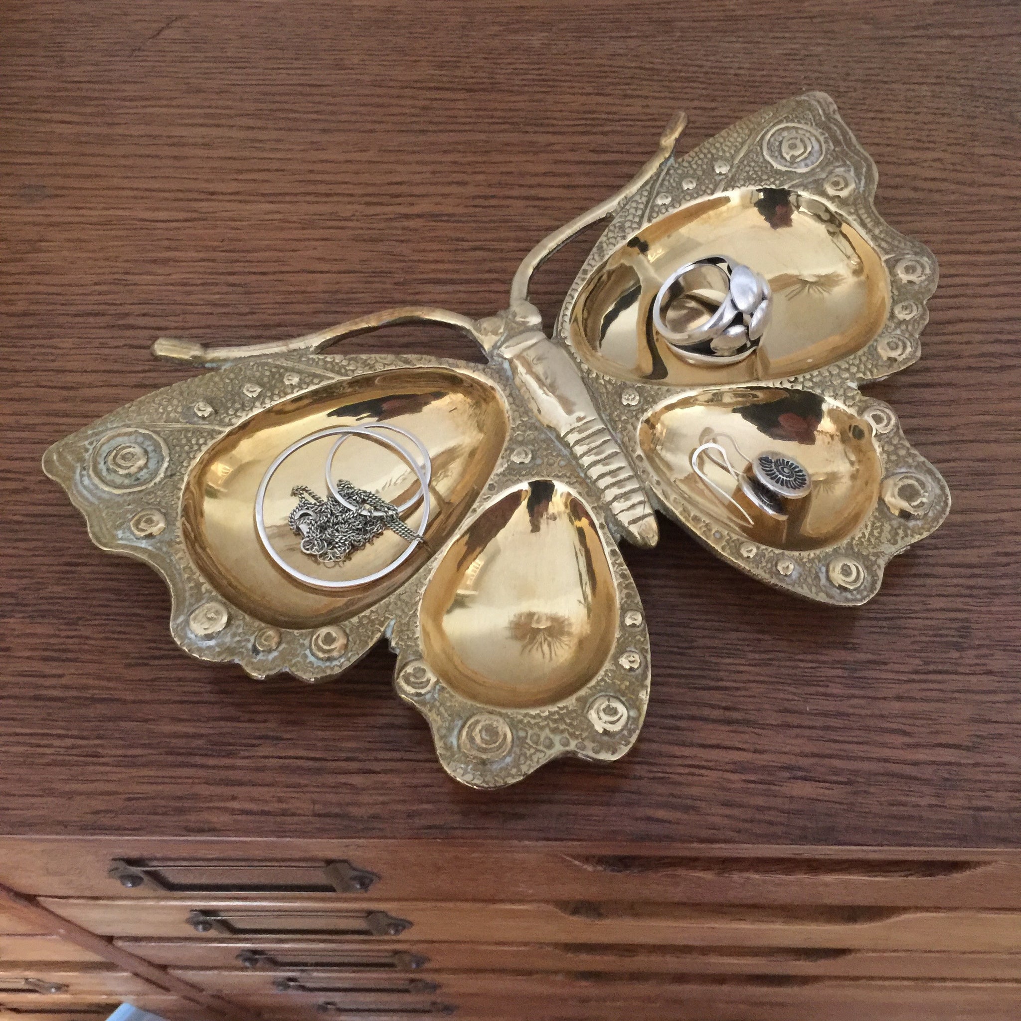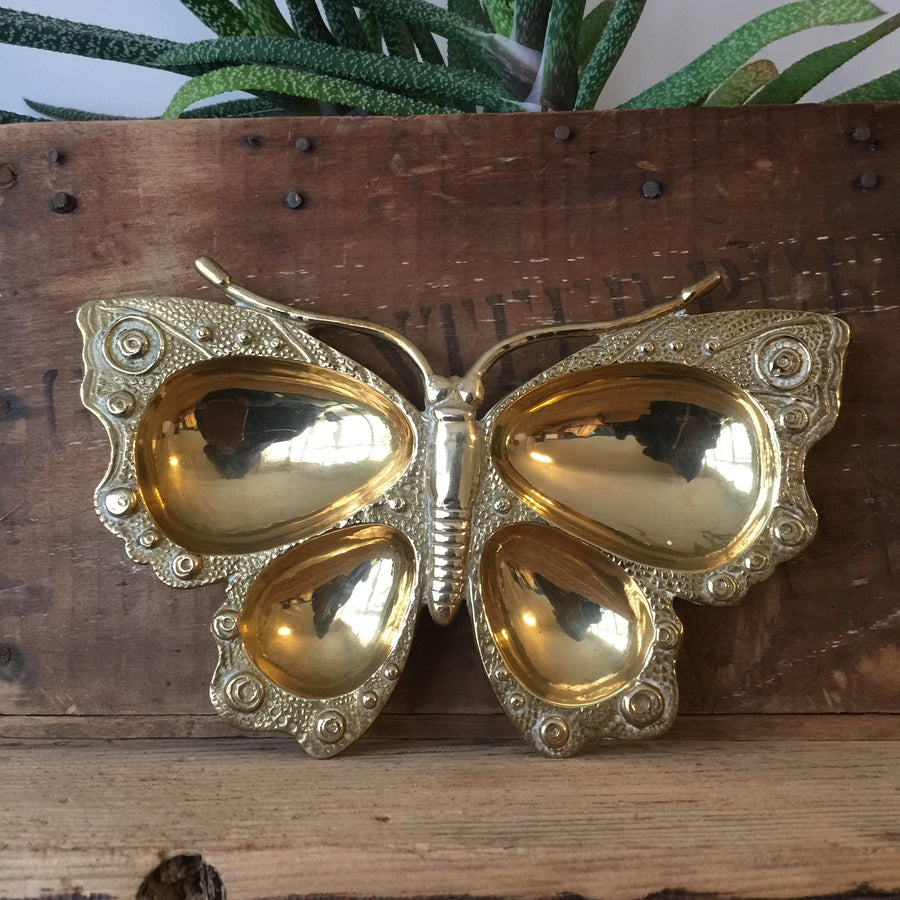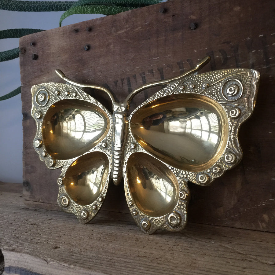 A striking ornamental vintage brass butterfly trinket dish - a very heavy and large piece compared to other small trinket dishes that we see. Very useful to store jewellery, or other small items, as shown in the photos.