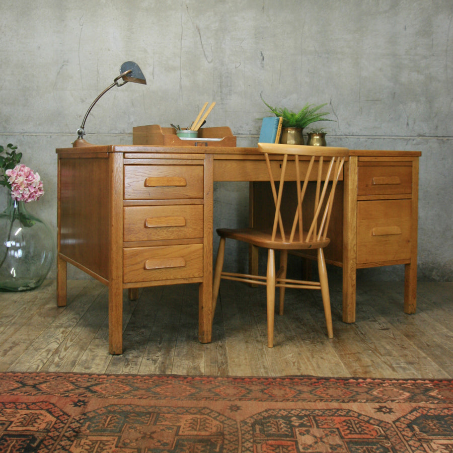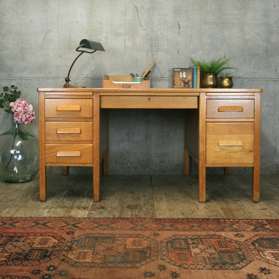 Constructed from solid oak and oak veneers, the desk features three solid oak drawers to the left side, two drawers to the right and pull out slides.