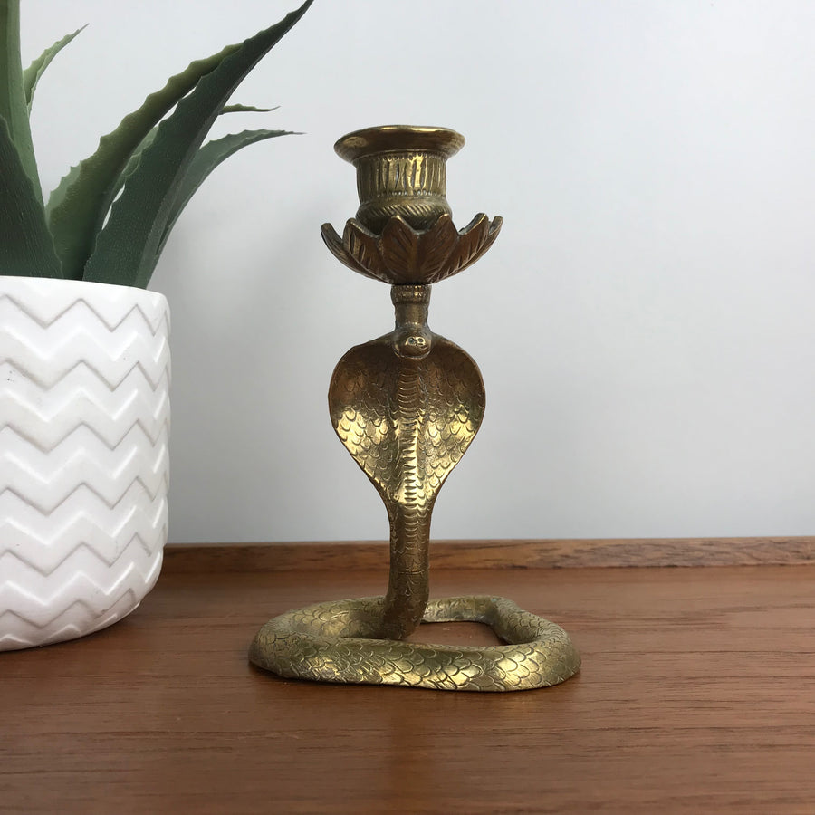 A stunning Mid Century brass cobra candlestick with beautiful etched detailing.