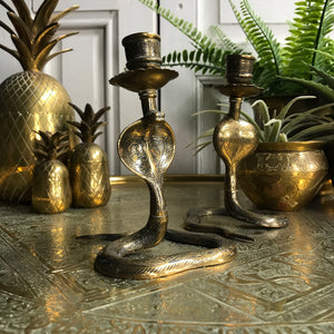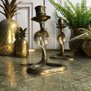 A pair of stunning Mid Century brass cobra candlesticks with beautiful detailing.