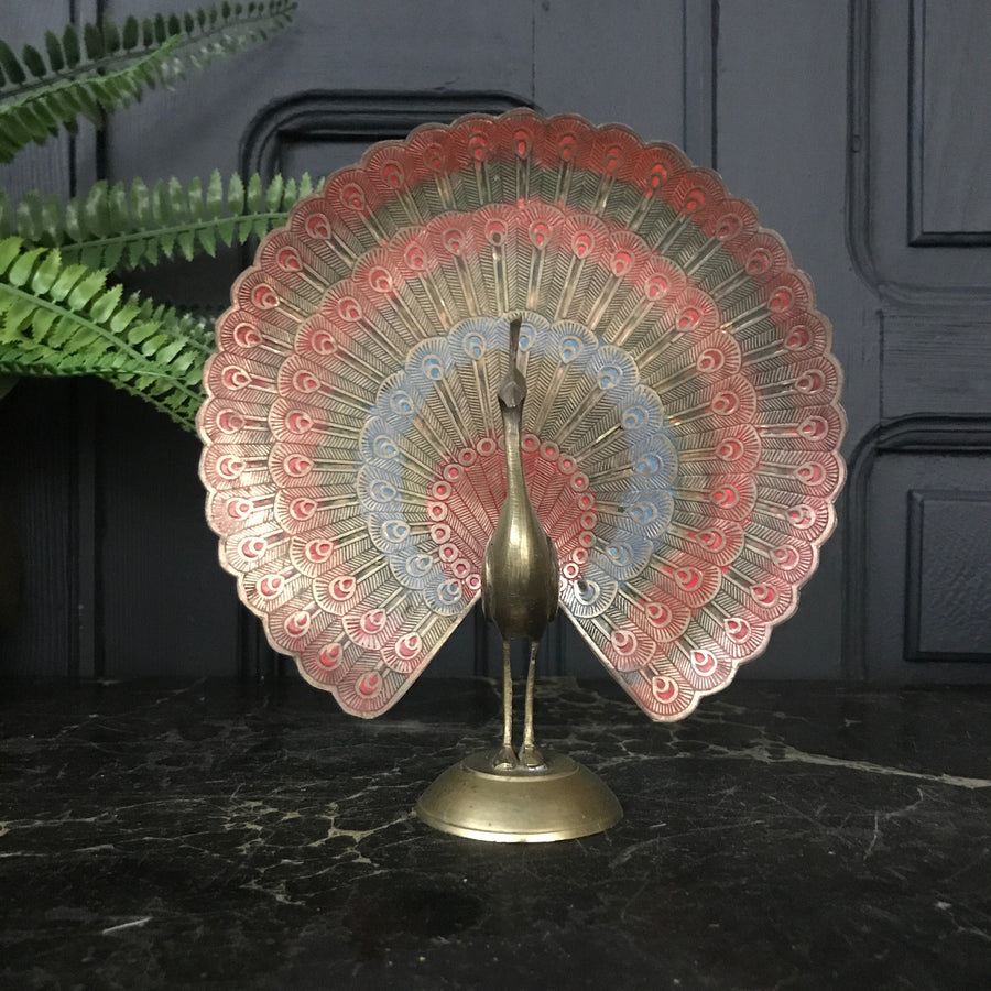 A stunning brass peacock ornament with beautiful, coloured engraving work - just look at those tail feathers!