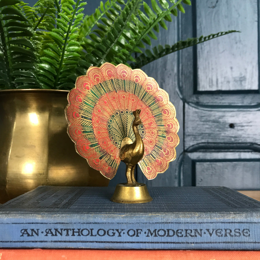 A stunning brass peacock ornament with beautiful coloured engraving work - just look at those tail feathers and how they catch the light!