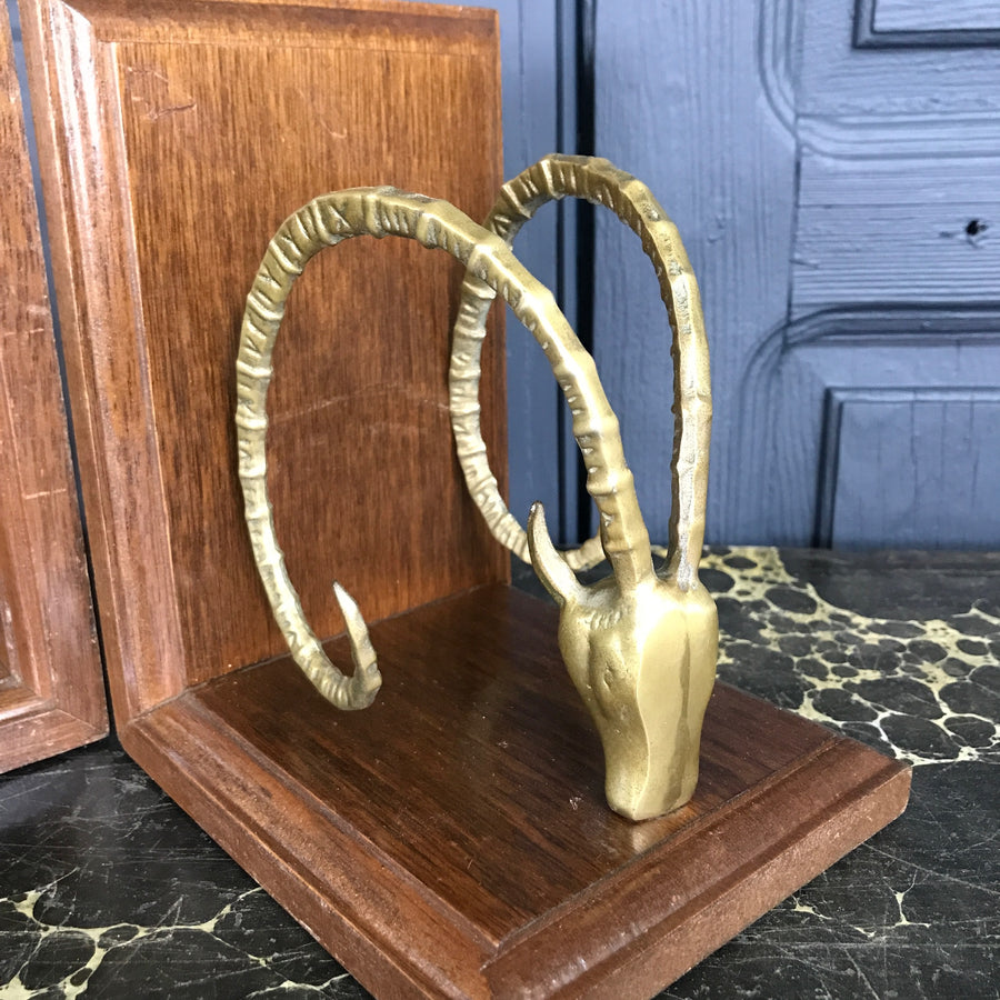 A stunning, decorative pair of vintage brass antelope bookends, mounted onto wood.