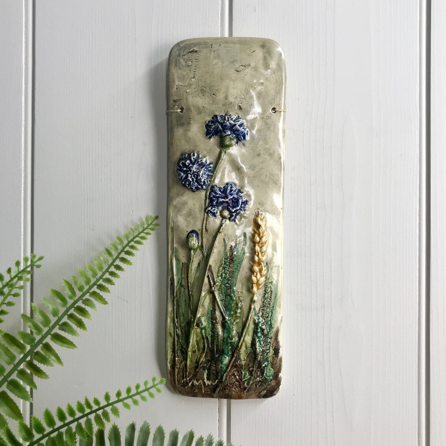 A beautifully delicate ceramic wall plaque with stunning hand painted wild flowers and detailing.