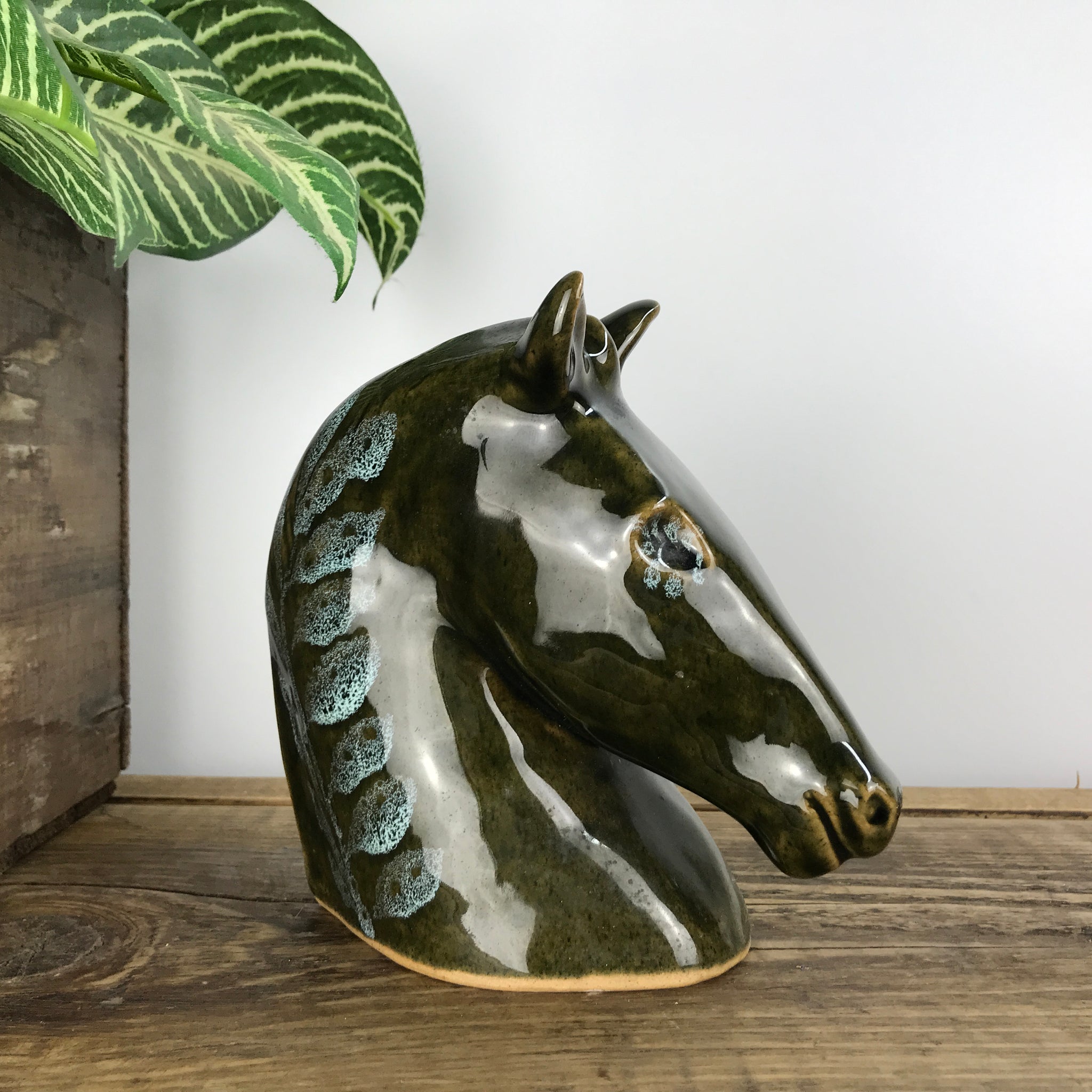 A Mid Century glazed ceramic horse head in a beautiful deep green colour - would make a stunning accessory to add to your interior styling.