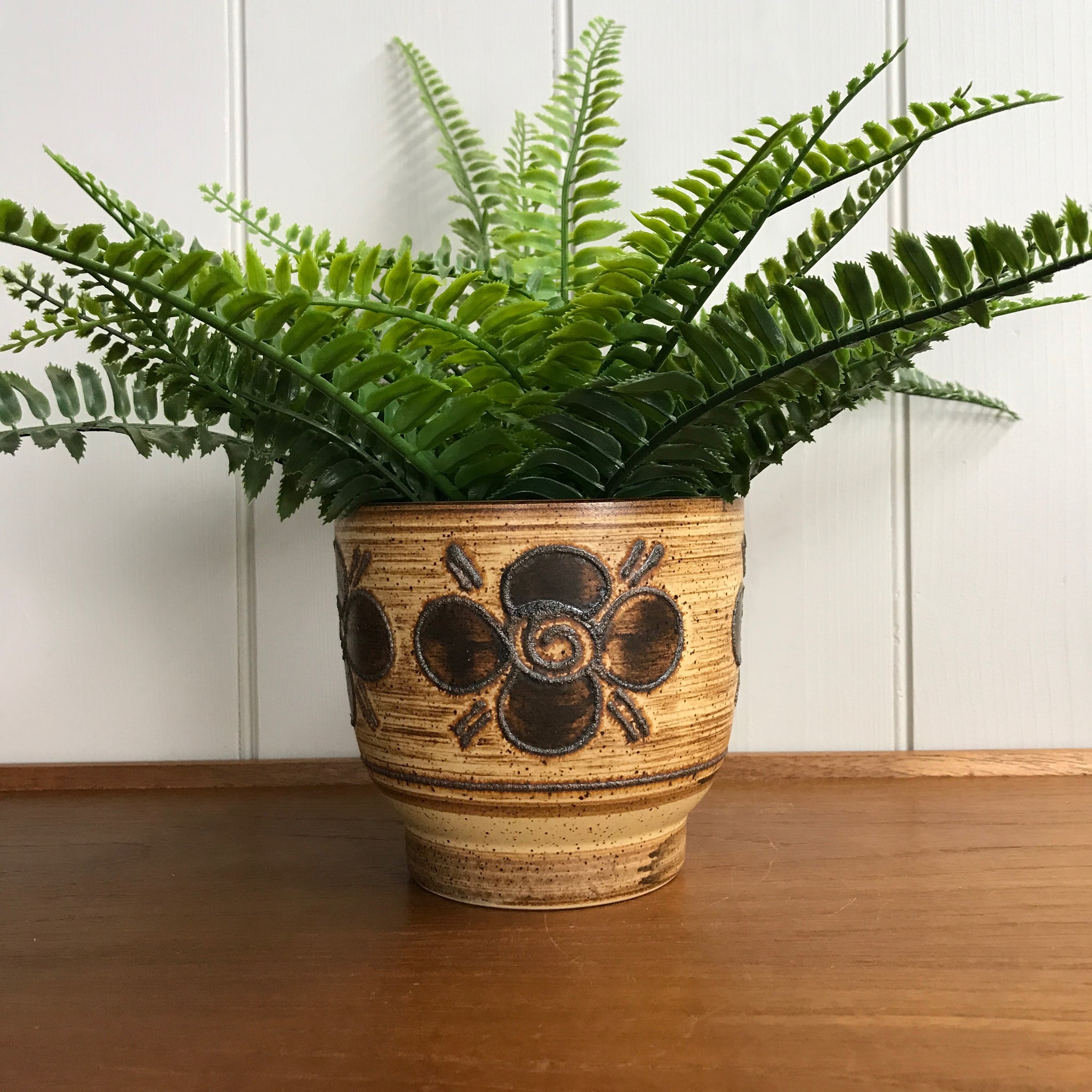 A beautiful Mid Century ceramic planter in Autumnal colours featuring a striking flower pattern. The perfect way to display your greenery in style!