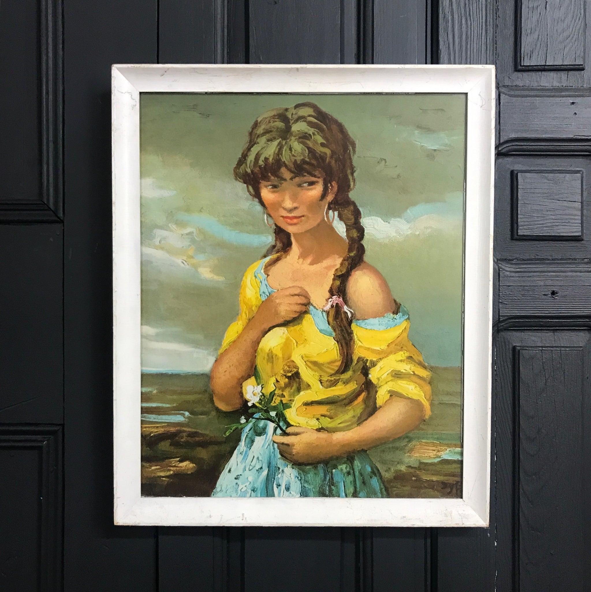An original Mid Century print on board of a girl holding flowers by the renowned artist Marcel Dyf. Presented in its original white wood frame with glass.