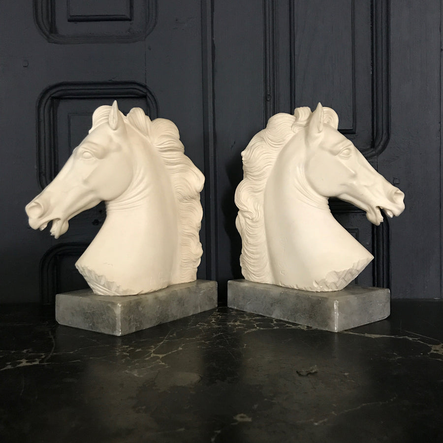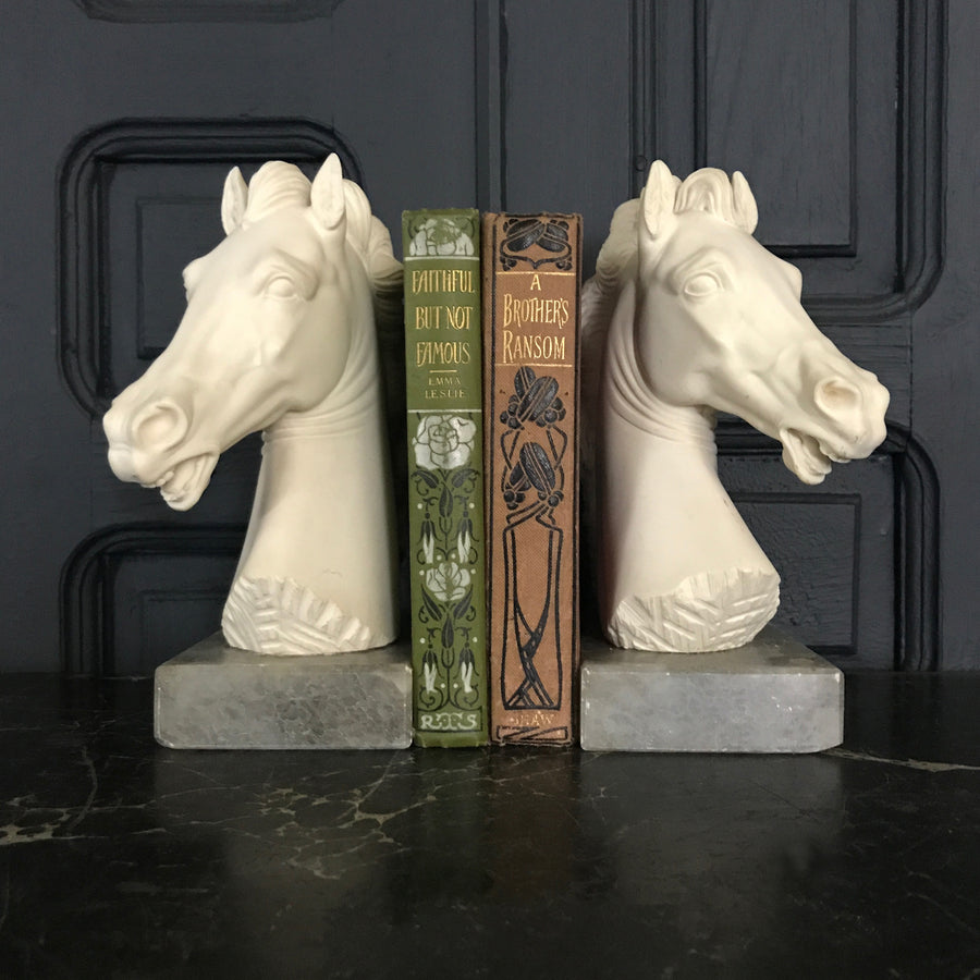These bookends would add a touch of opulence to any interior. They have an Art Deco feel to them and would look beautiful styled in an 'eclectic' inspired interior. The ivory colour of the horse heads also works very well within a dark interior as shown in the photos.