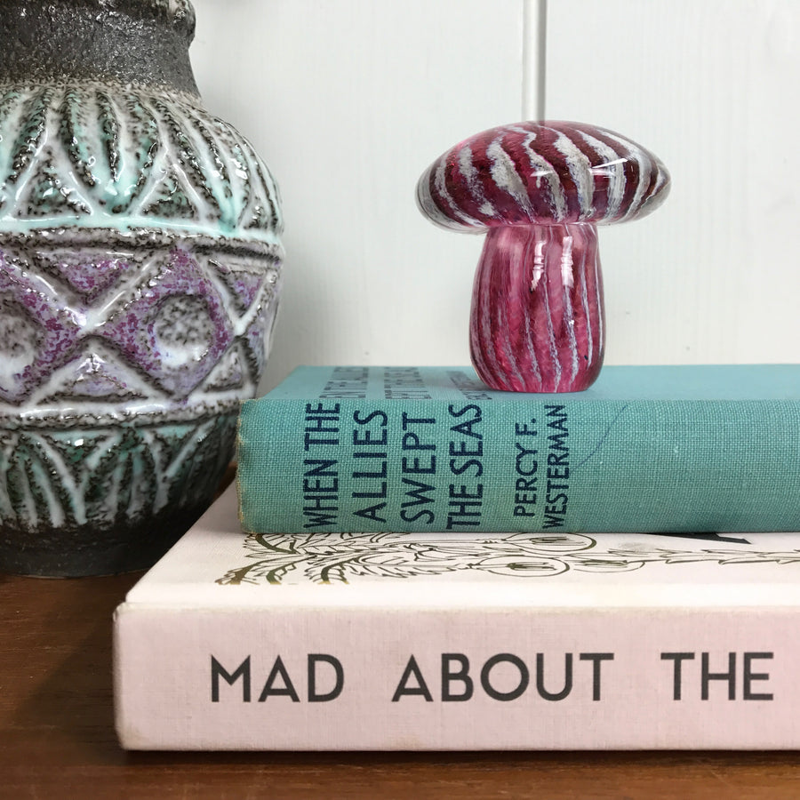 An elegant vintage glass mushroom paperweight featuring a stunning pink design.