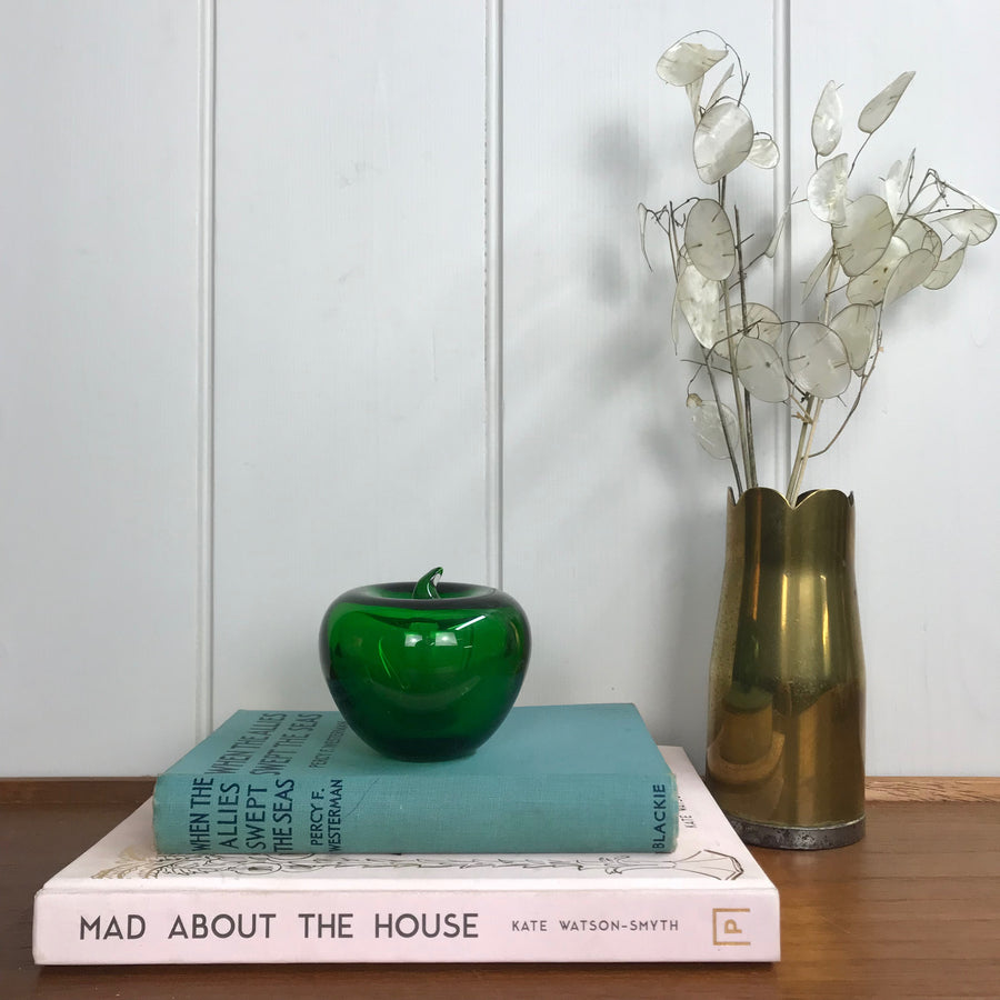 A vintage glass apple paperweight/ornament in a striking green colour - the perfect accessory to add to your interior styling and to add a pop of colour!