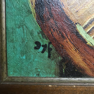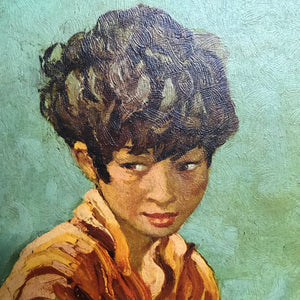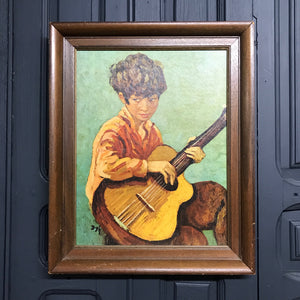 An original Mid Century print on textured board of a boy playing the guitar by renowned artist Marcel Dyf. Presented in its original dark wood frame without glass.