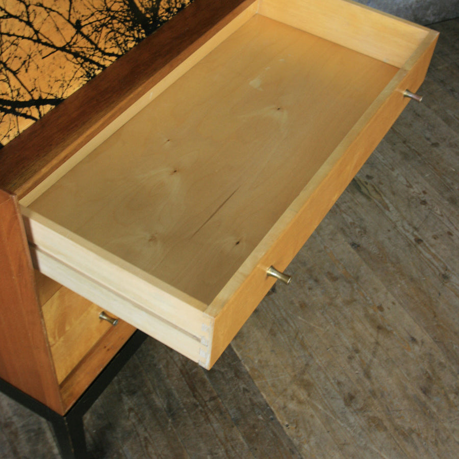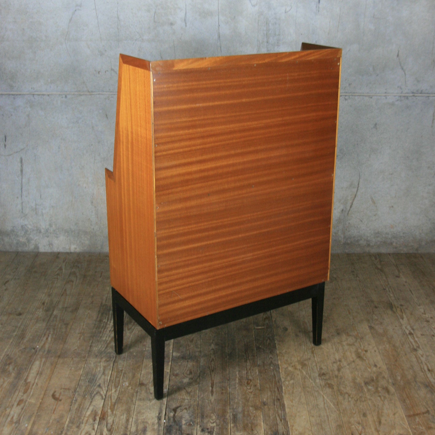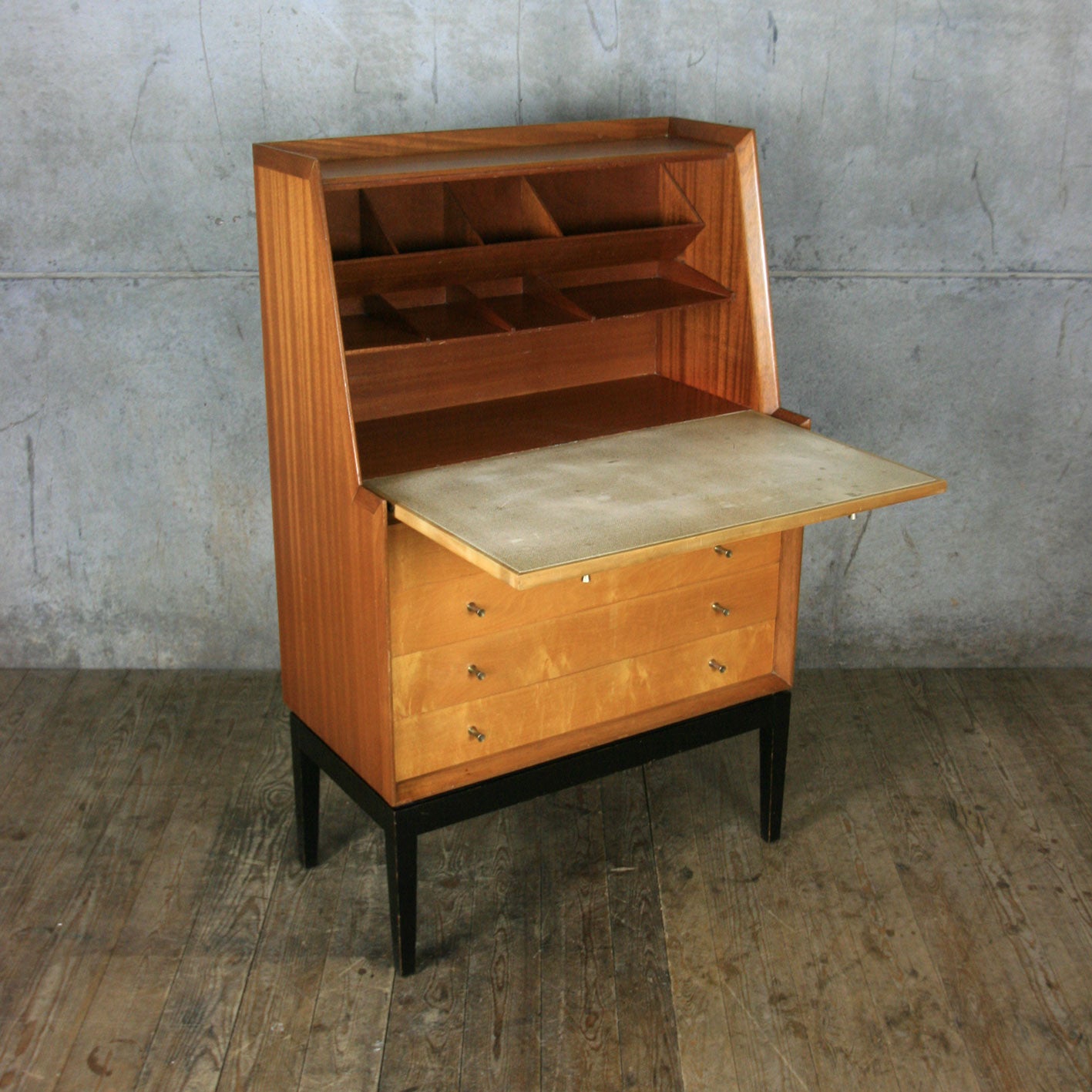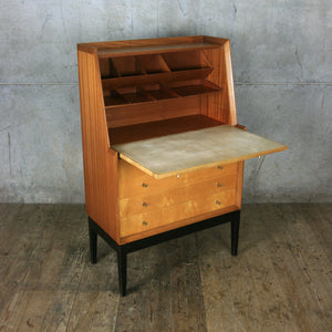 Features stunning maple & teak veneers, drop down writing surface and filing compartments. Four good sized drawers with simplistic brass drawer pulls. The cabinet sits on a ebonised base.