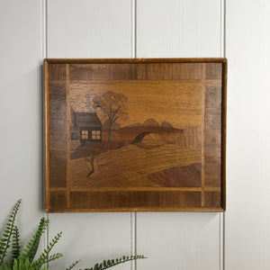 Mid Century framed marquetry picture of a landscape, with beautiful warm wood texture and patina.