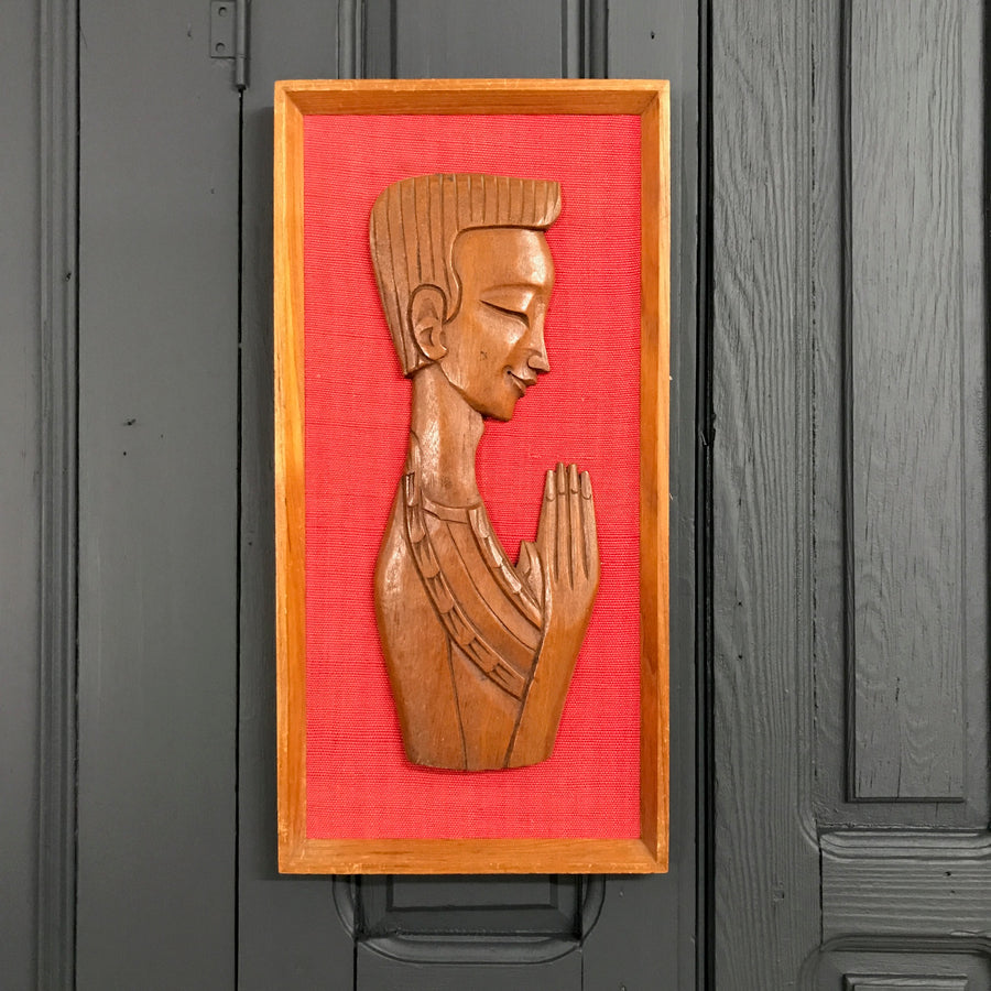 A stunning Mid Century carving of a praying man mounted onto red fabric and framed in teak wood. A beautiful Mid Century piece.