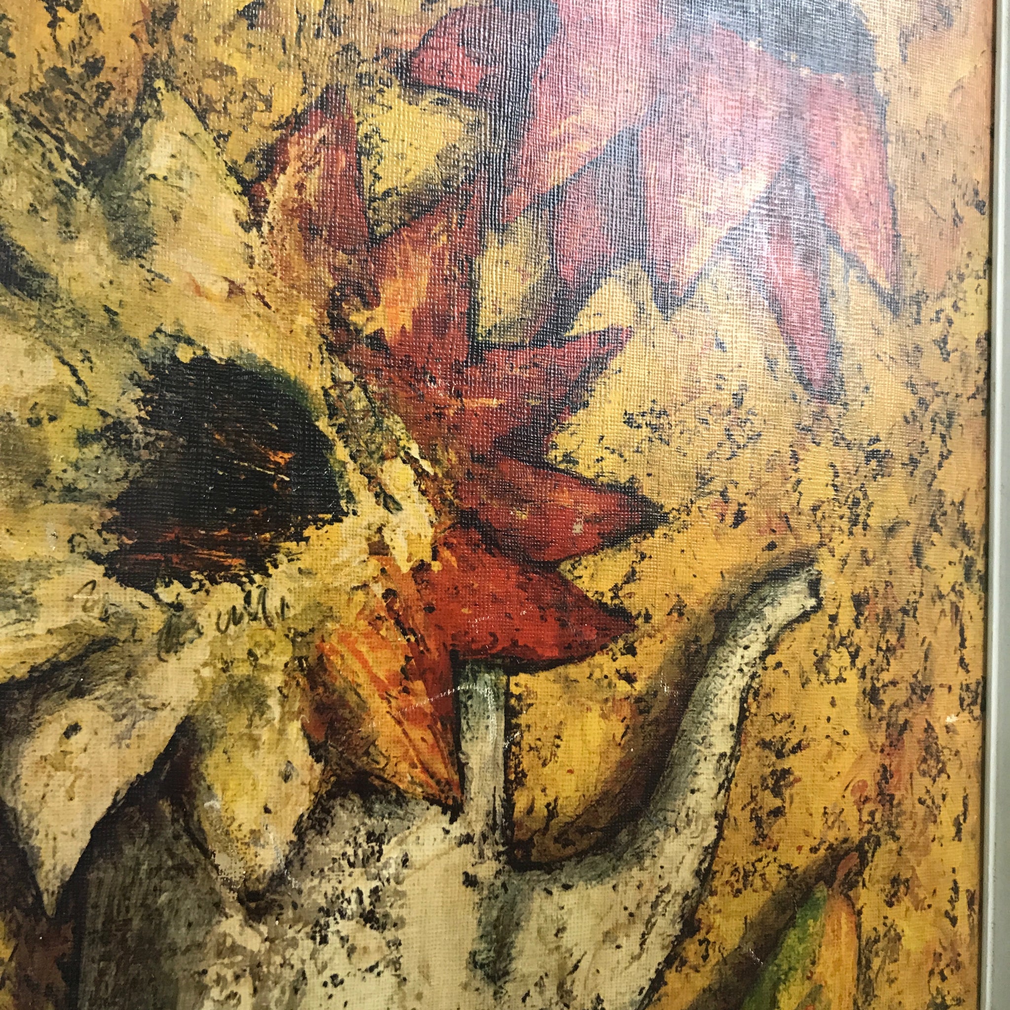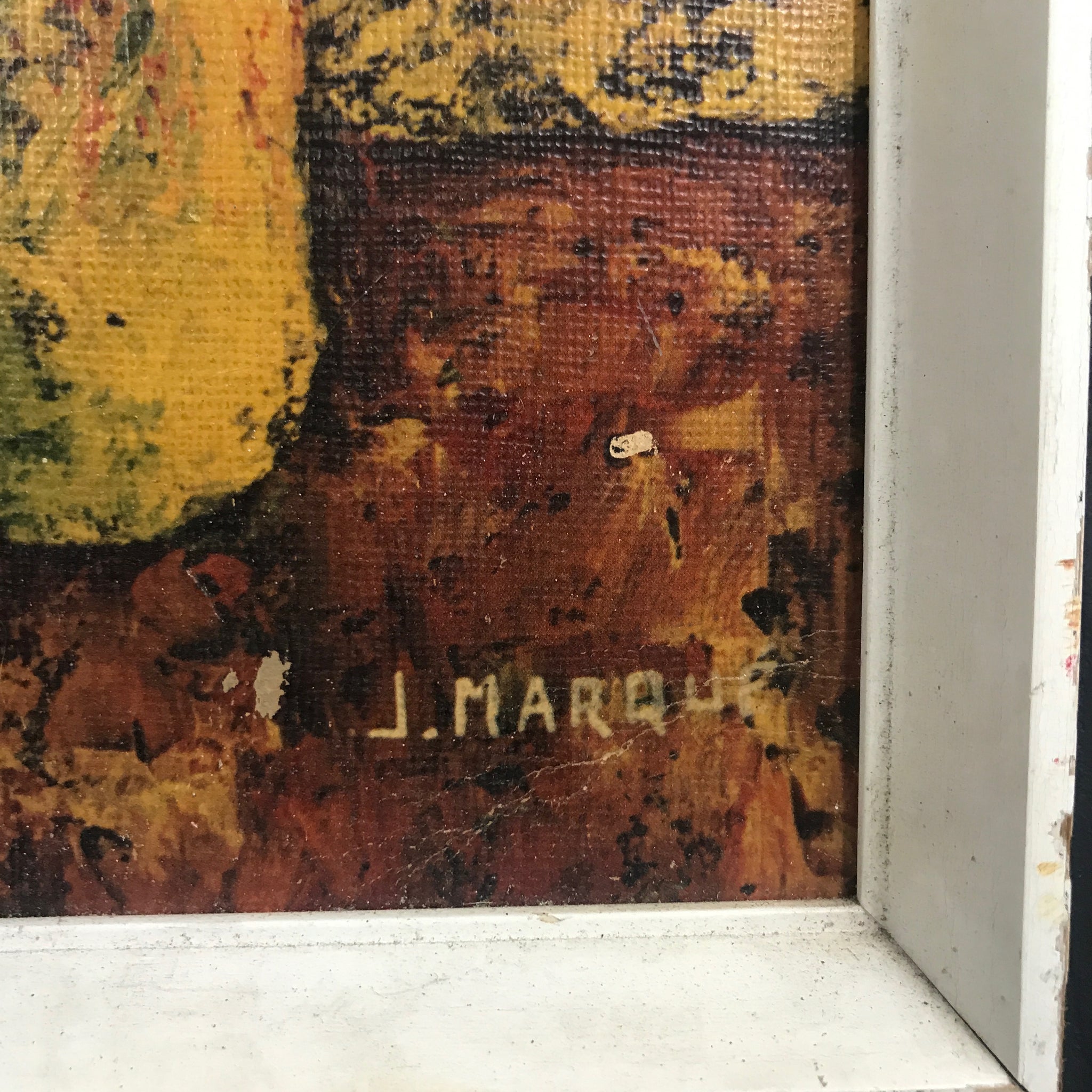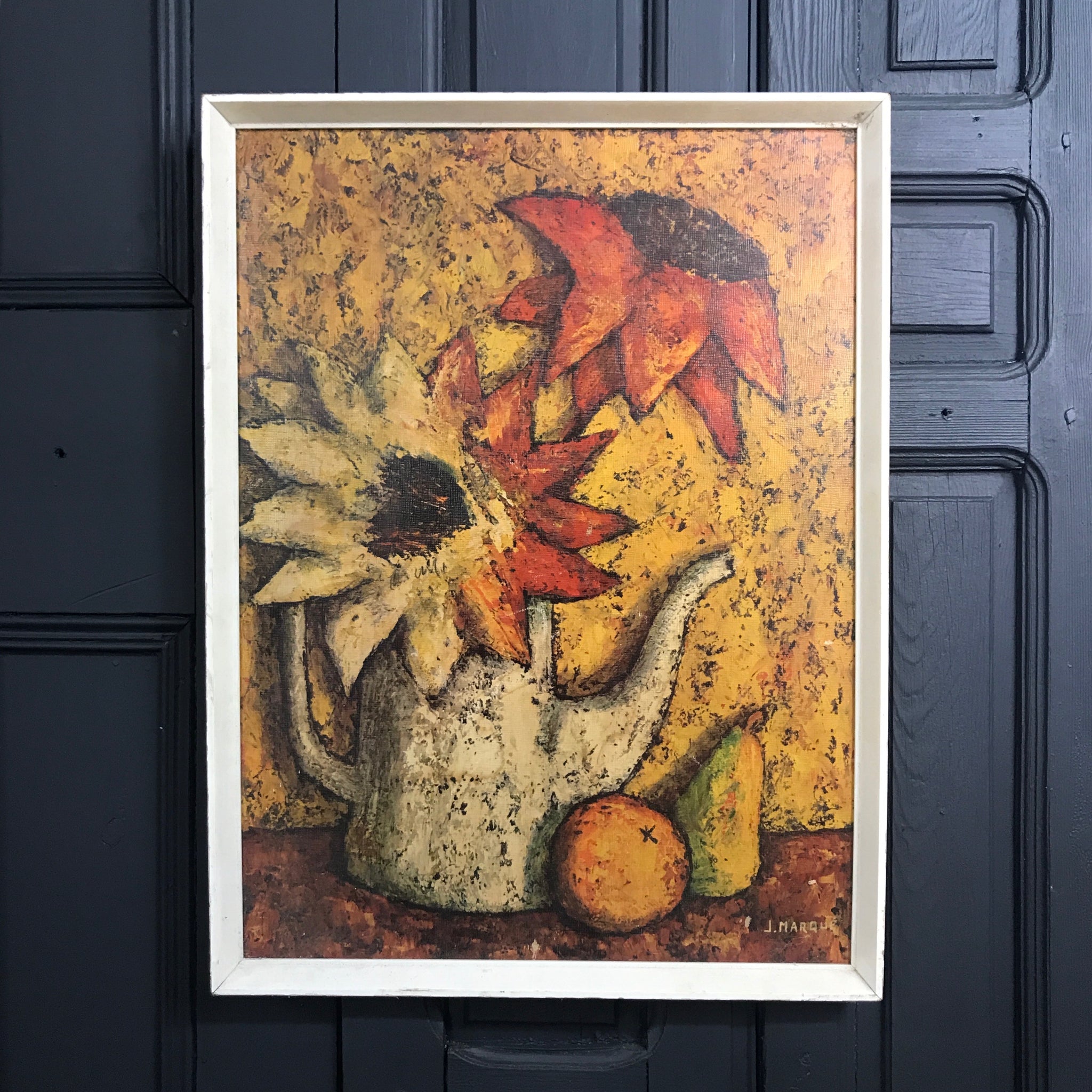 A beautiful French Mid Century still life print by J Marque - features vibrant bright colours and comes in it's original off white frame (no glass).