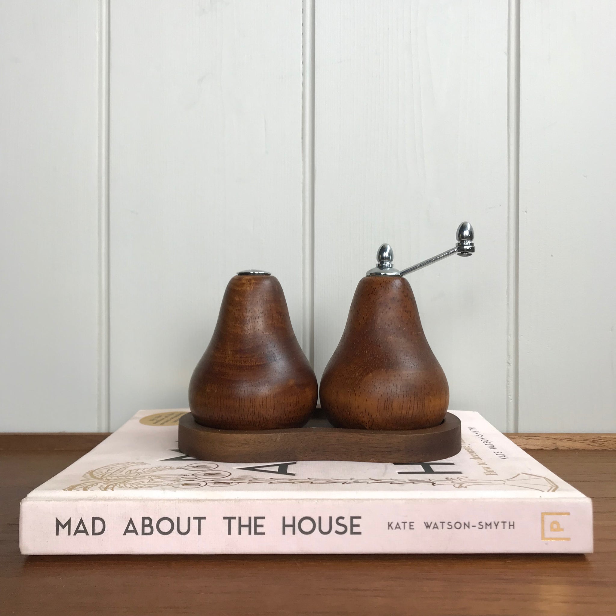 A teak Mid Century pear shaped salt & pepper cruet set. This cute set would look beautiful in any vintage inspired interior.