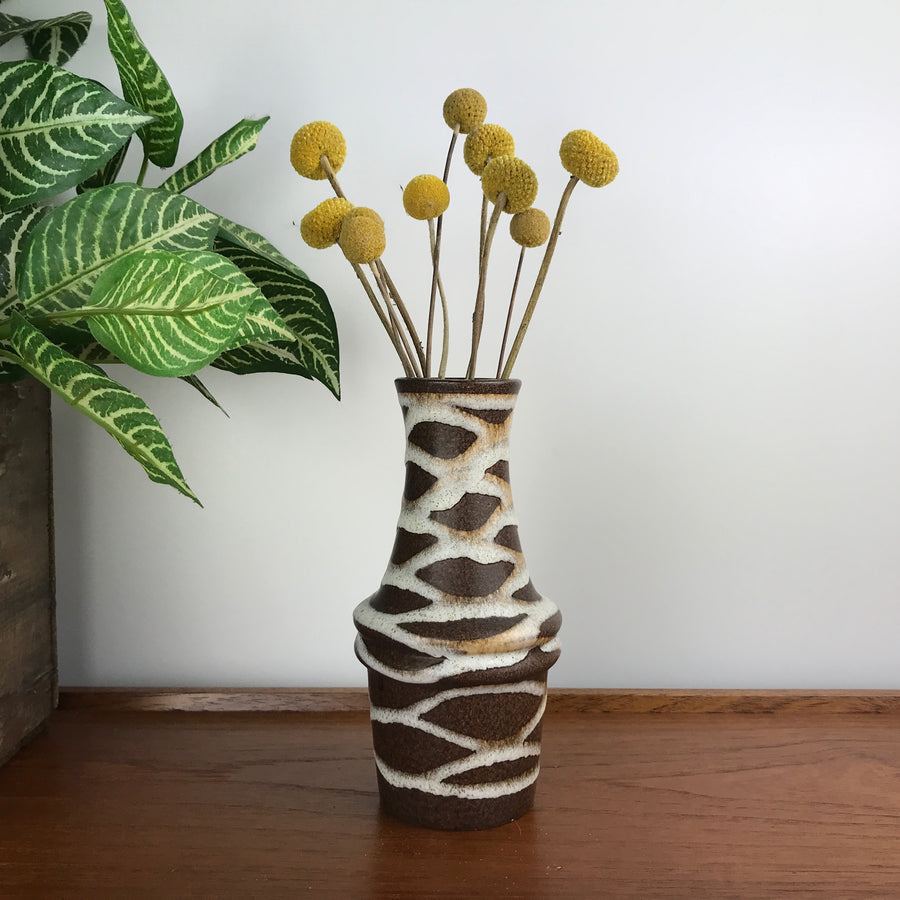 West German Mid Century ceramic vase by Scheurich Keramik featuring a rare brown and white pattern detail.