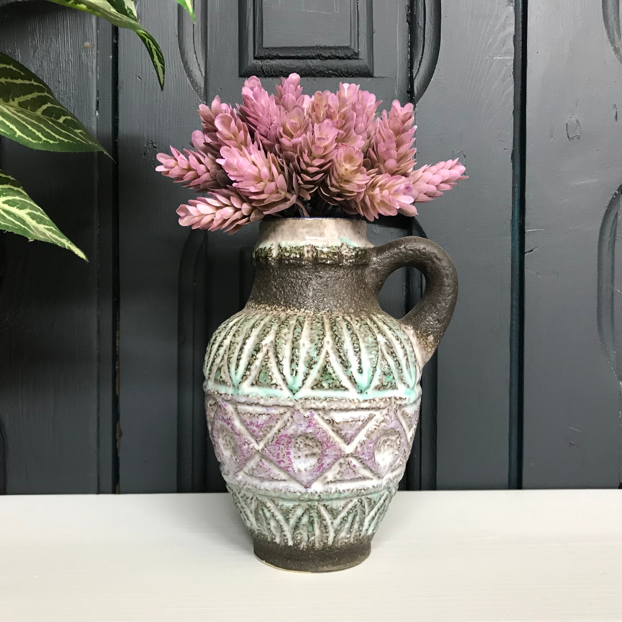 A Mid Century ceramic vase featuring a very unusual pattern and beautiful colours, produced in West Germany.