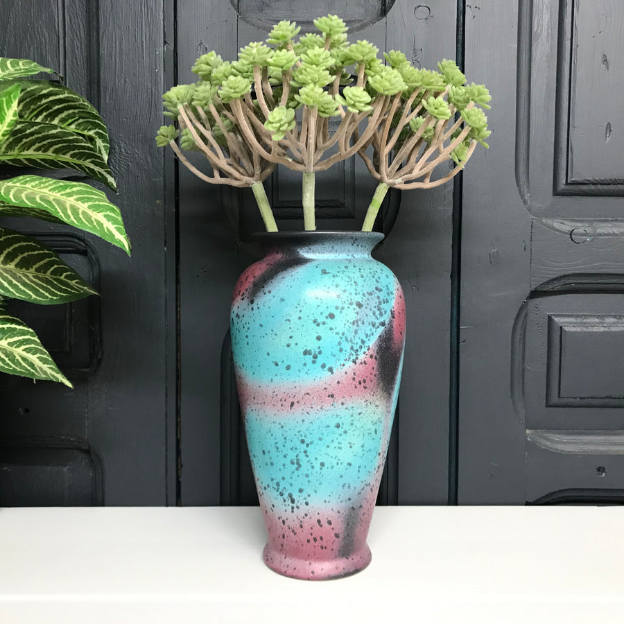 Mid Century ceramic vase featuring a rare design of pink, blue, and mottled black. A beautiful example of West Germany pottery, and our favourite piece to date!