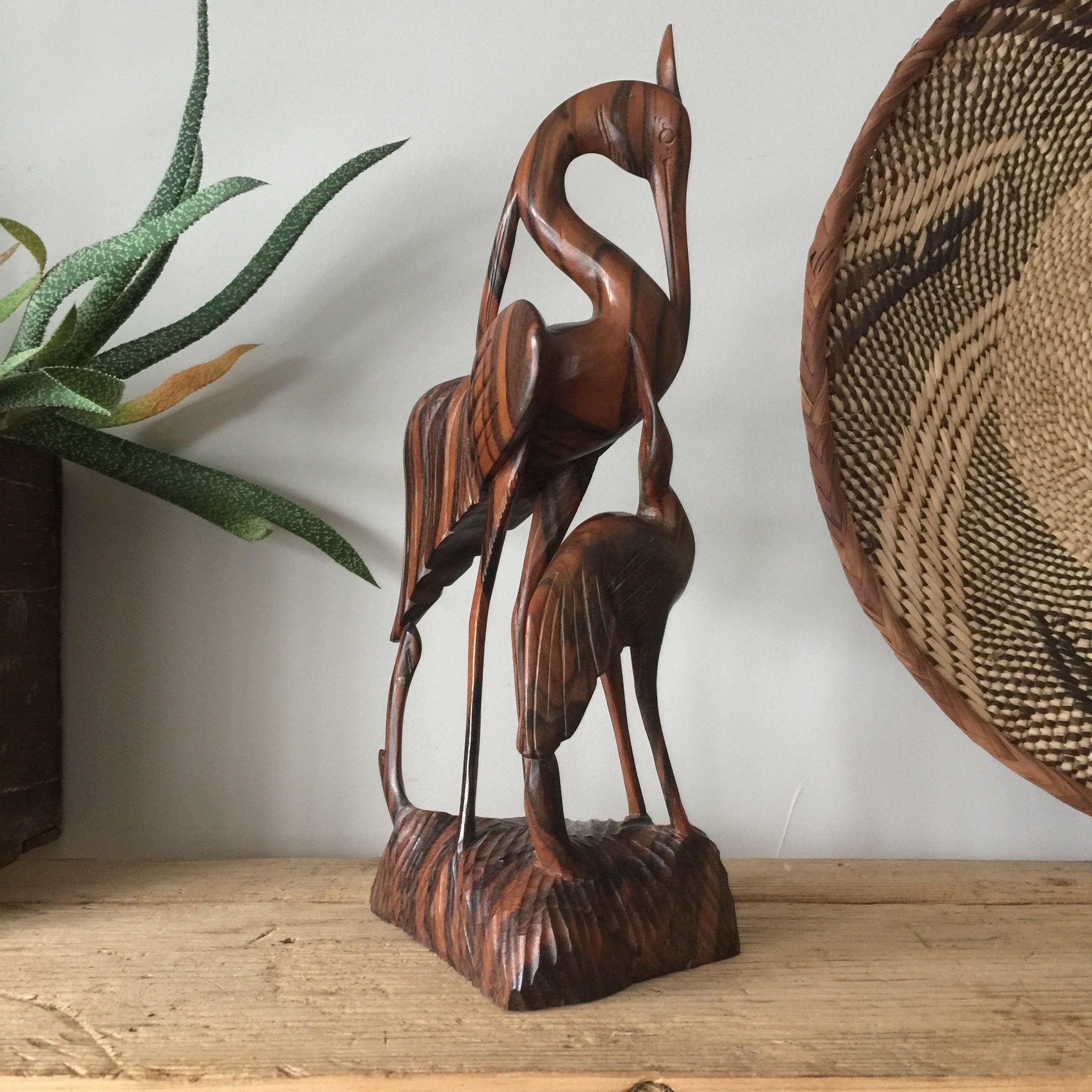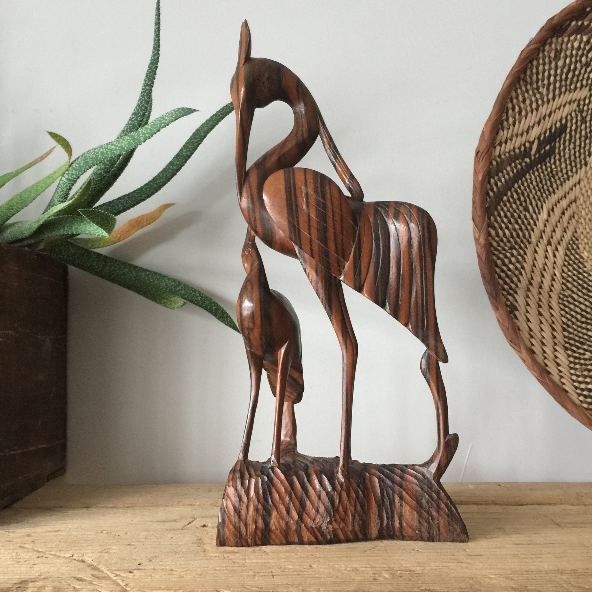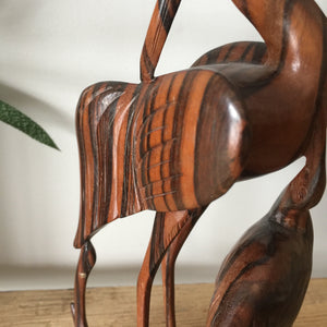 A striking, vintage wood carving depicting an adult crane feeding its young. A highly unusual piece which would look fantastic placed on a sideboard or shelf. We particular love the striped grain on this piece - which appears to look like zebrawood.