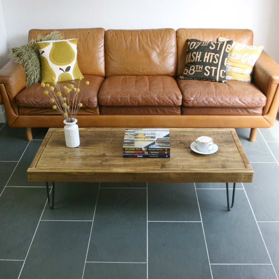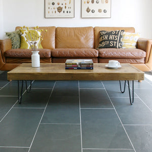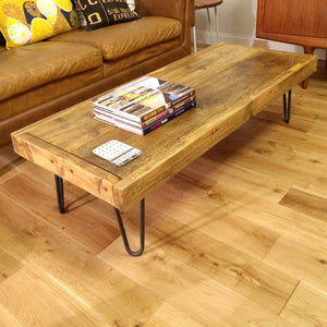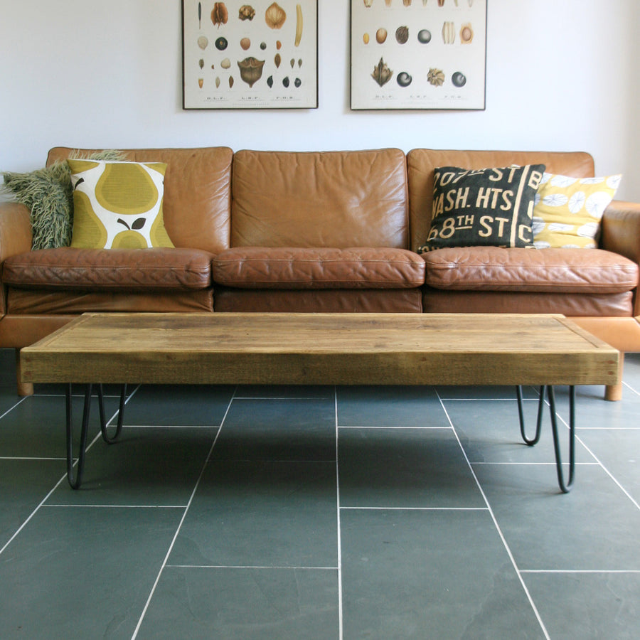 A stunning coffee table that combines rustic, industrial, vintage and mid century modern! designed and produced by us at Mustard vintage in Great Britain, these coffee tables are constructed using a handmade rustic top using reclaimed timber combined with handcrafted steel hairpin legs.