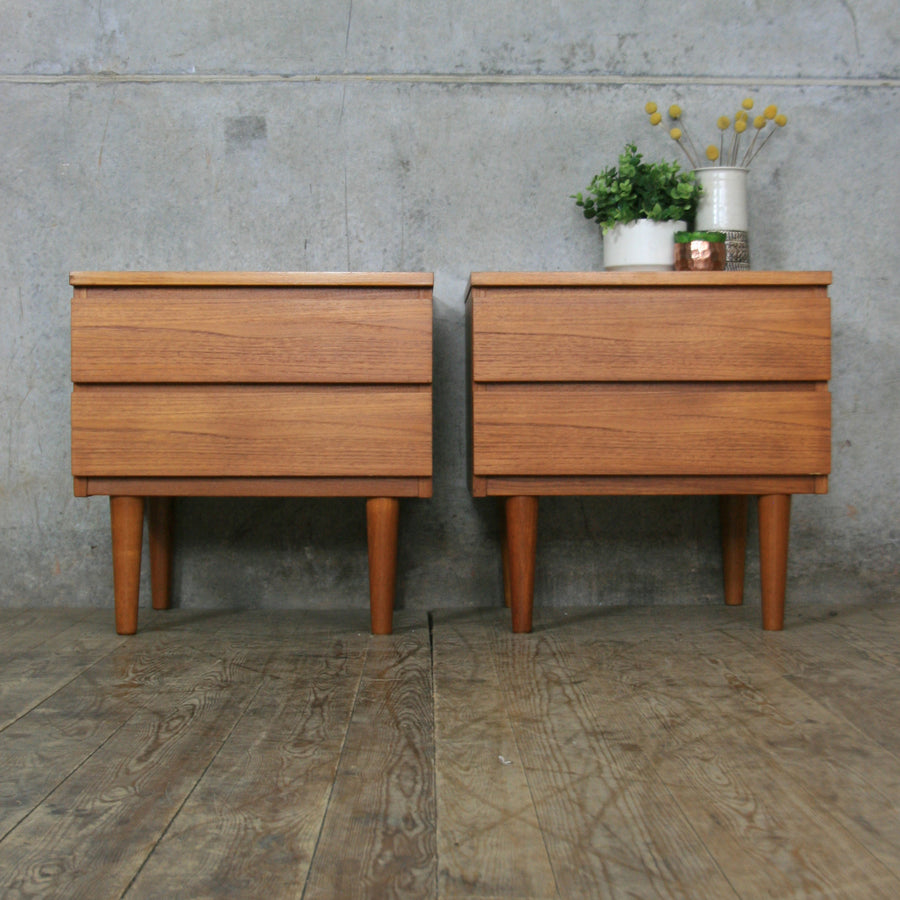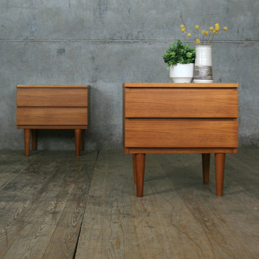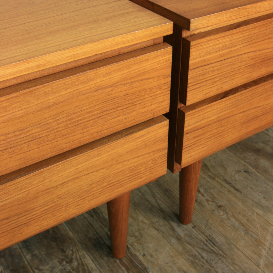 A beautifully simplistic pair of teak bedside cabinets believed to be of Danish origin and dated to the 1960's period.