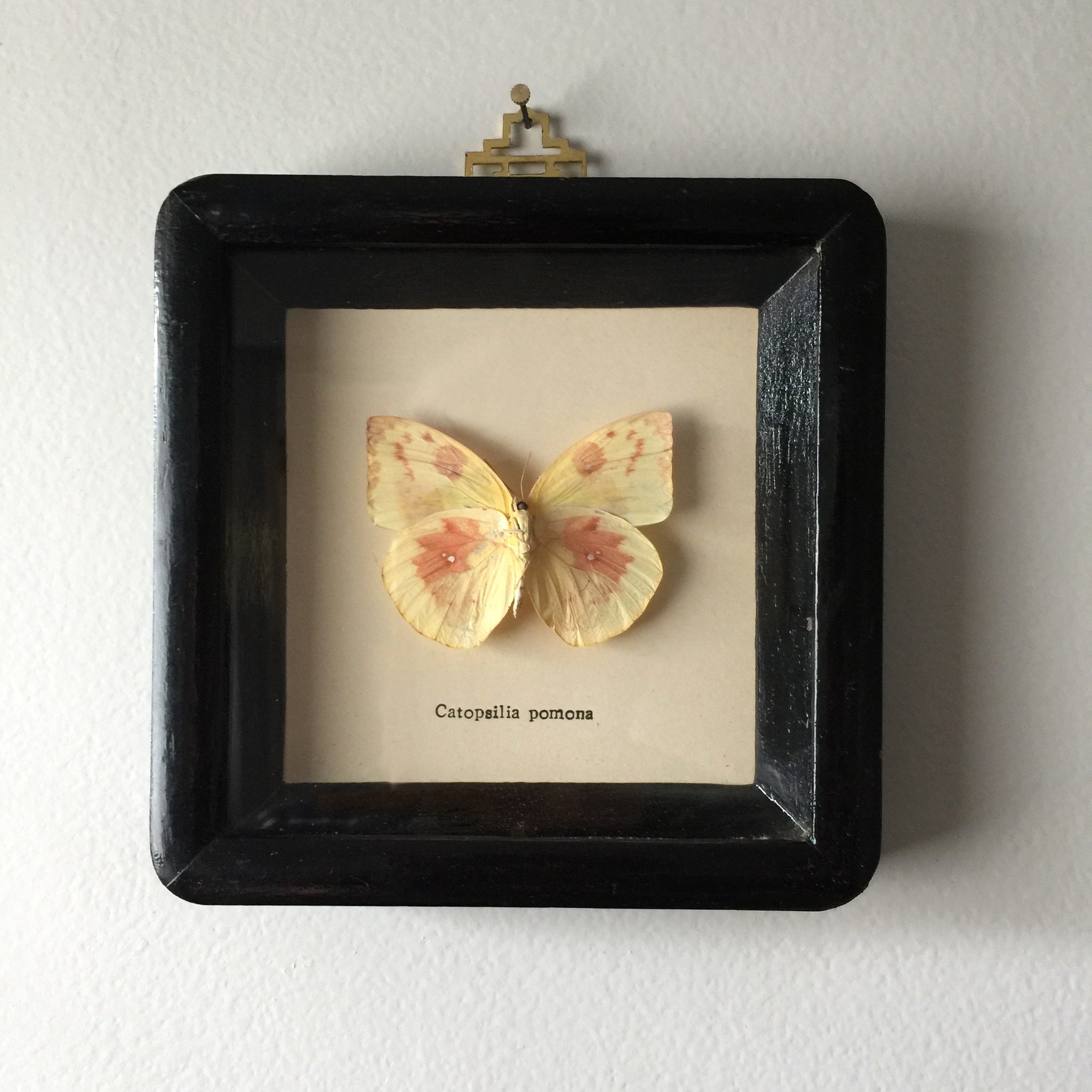 A stunning vintage 'Catopsilia pomona' taxidermy female butterfly, set within its original curved black edged frame with glass intact - believed to be from the 1930s.