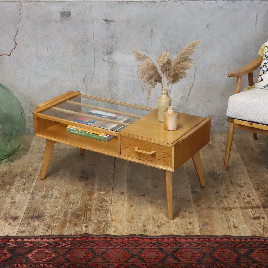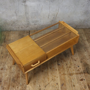 A scarcely seen coffee table manufactured by E-Gomme (later became G-Plan) designed as part of the Brandon range in the 1950s. Kknown as a Cocktail Table - the glass top was used for cocktails before a meal.