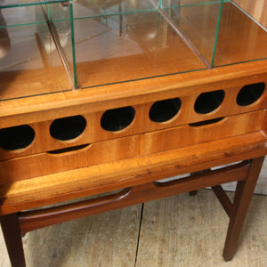 In excellent restored condition, there are some polished in marks and scratches to the teak and glass serving area as to be expected for its age.