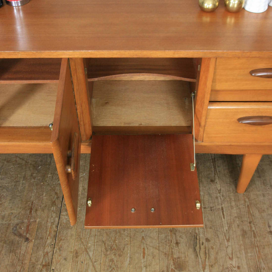 Featuring contrasting solid teak door & drawer handles, two drawers, drinks cupboard and twin doors opening into useful shelved cupboard space.