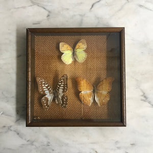 A trio of taxidermy butterflies in a beautiful warm colours, set within its original wooden frame with glass - mounted onto a hessian backing.