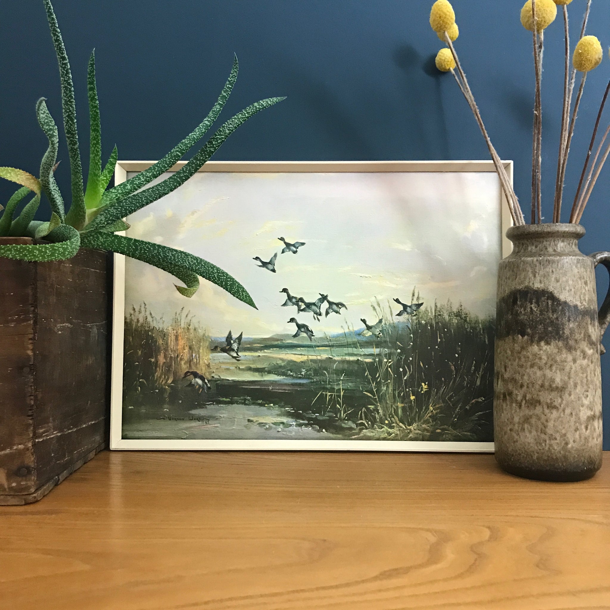 A beautiful original 1960s print by Vernon Ward of ducks in flight presented in its original off-white frame.