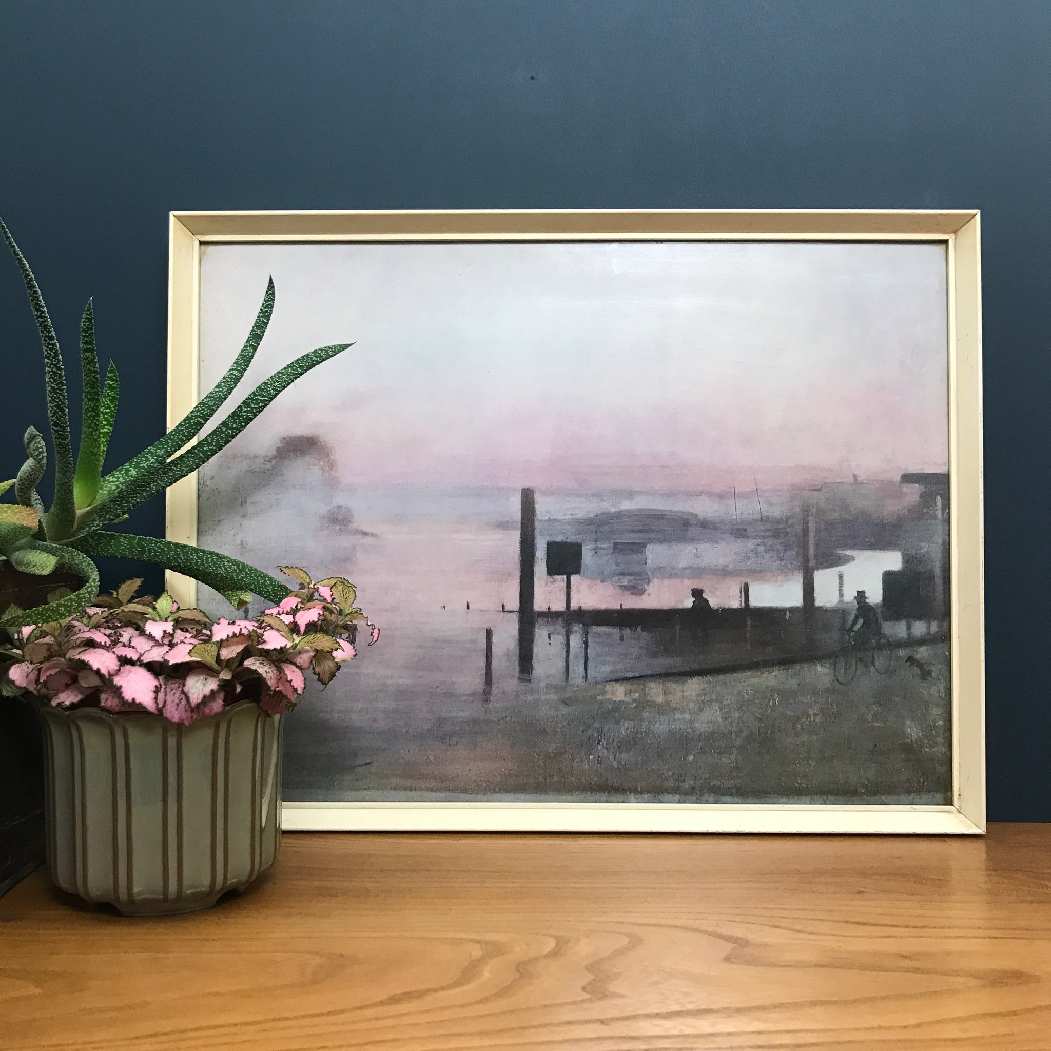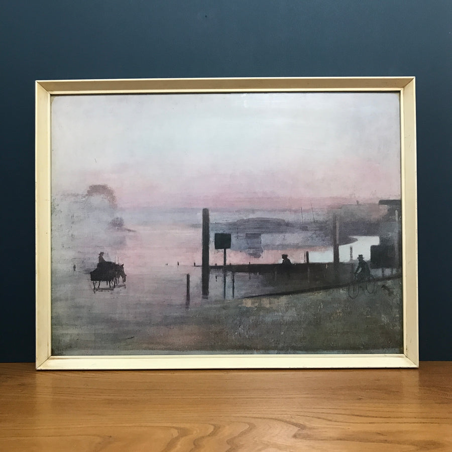 An original 1960s print of a coastal scene in a beautiful colour palette of blush pinks, greys and blacks. Presented in its original off-white frame with glass.