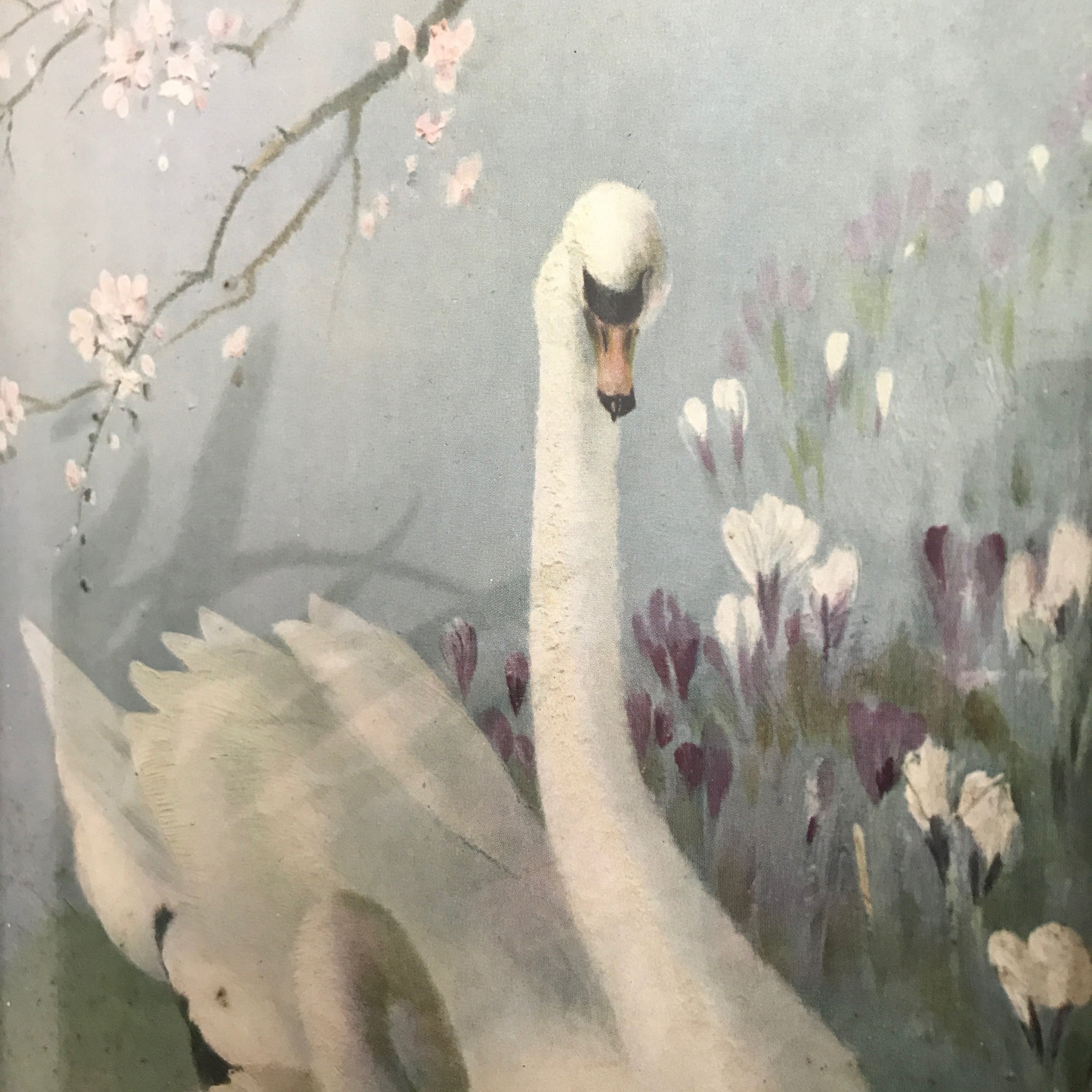 A beautiful original 1960s print depicting swans by Vernon Ward - presented in its original off-white frame and glass.