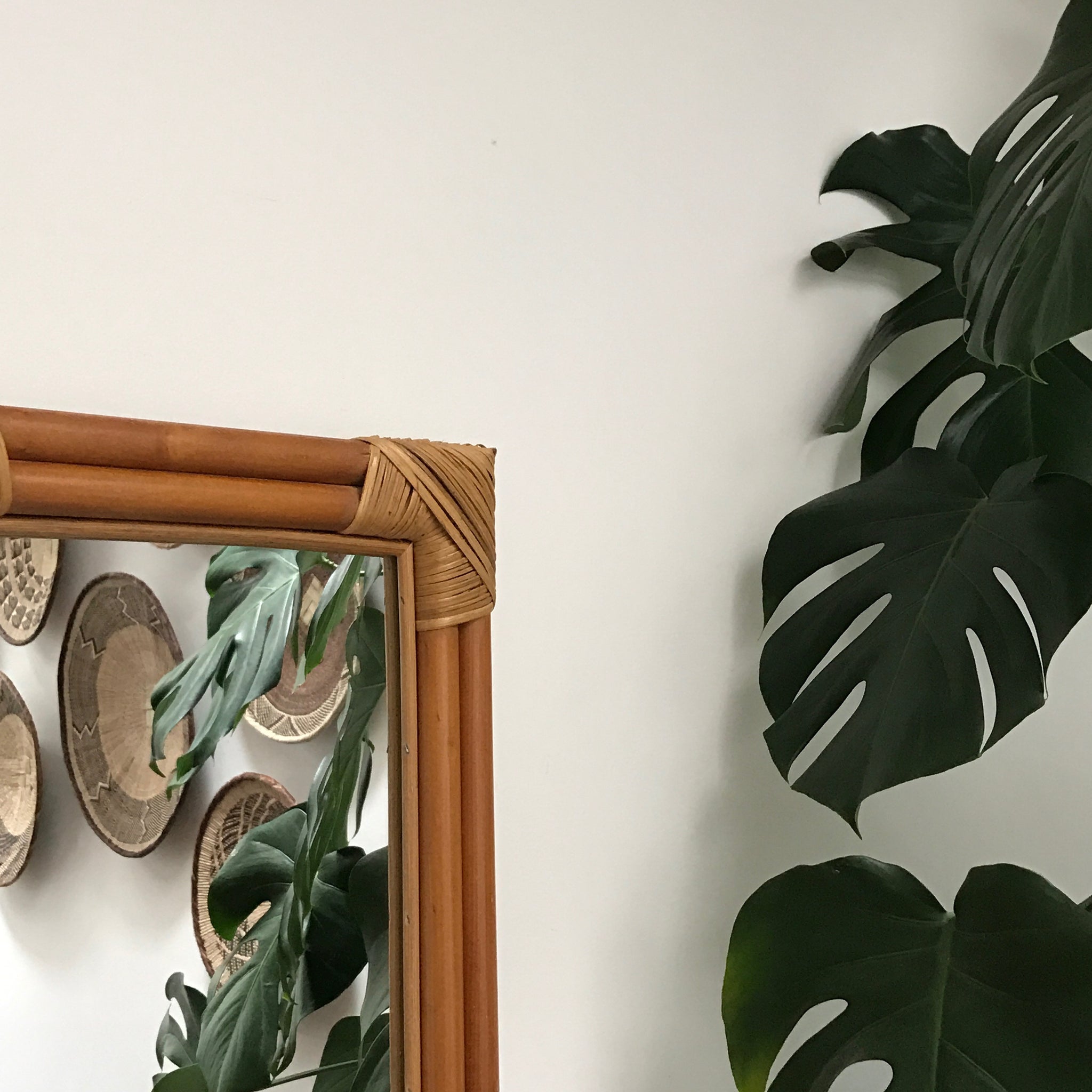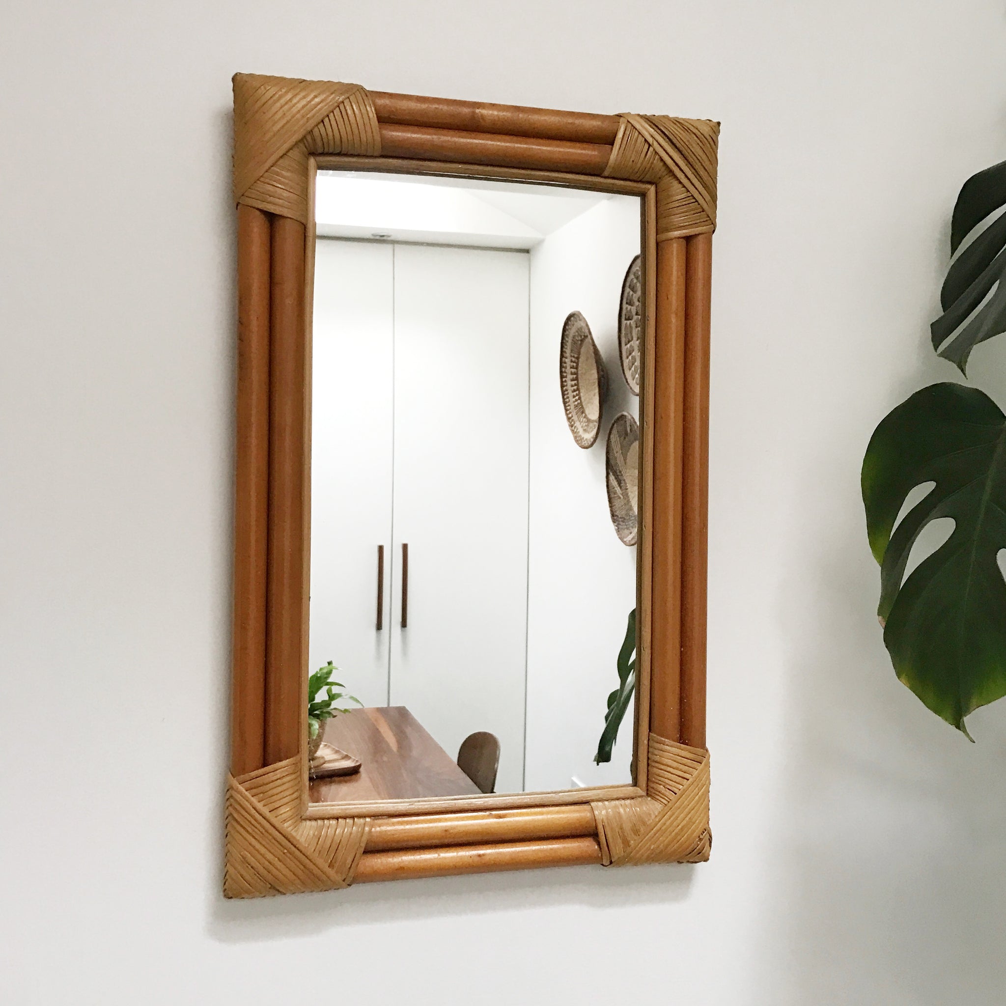 A vintage bamboo mirror with beautiful grass detail at each corner. Would make a great addition to any vintage or boho inspired interior, and look great with your greenery!