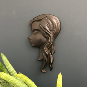 A decorative chalkware wall plaque in matt black, depicting a 1960s lady with long flowing hair. Beautiful detailing and a very rare find, especially in this condition!