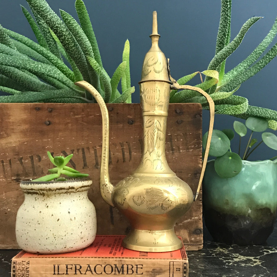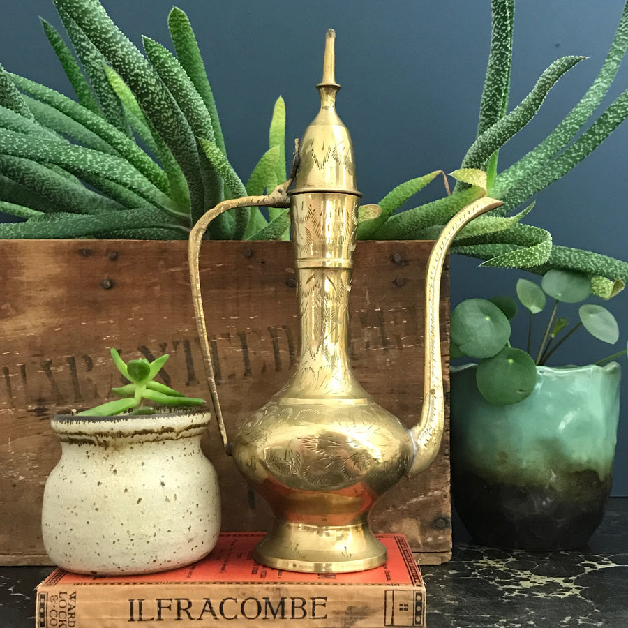 A beautiful vintage brass Middle Eastern tea pot with stunning engraving work.