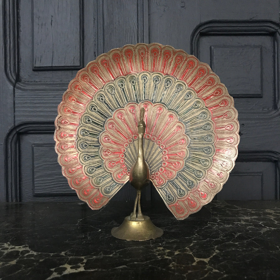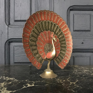 A stunning brass peacock ornament with beautiful coloured engraving work - just look at those tail feathers and how they catch the light!