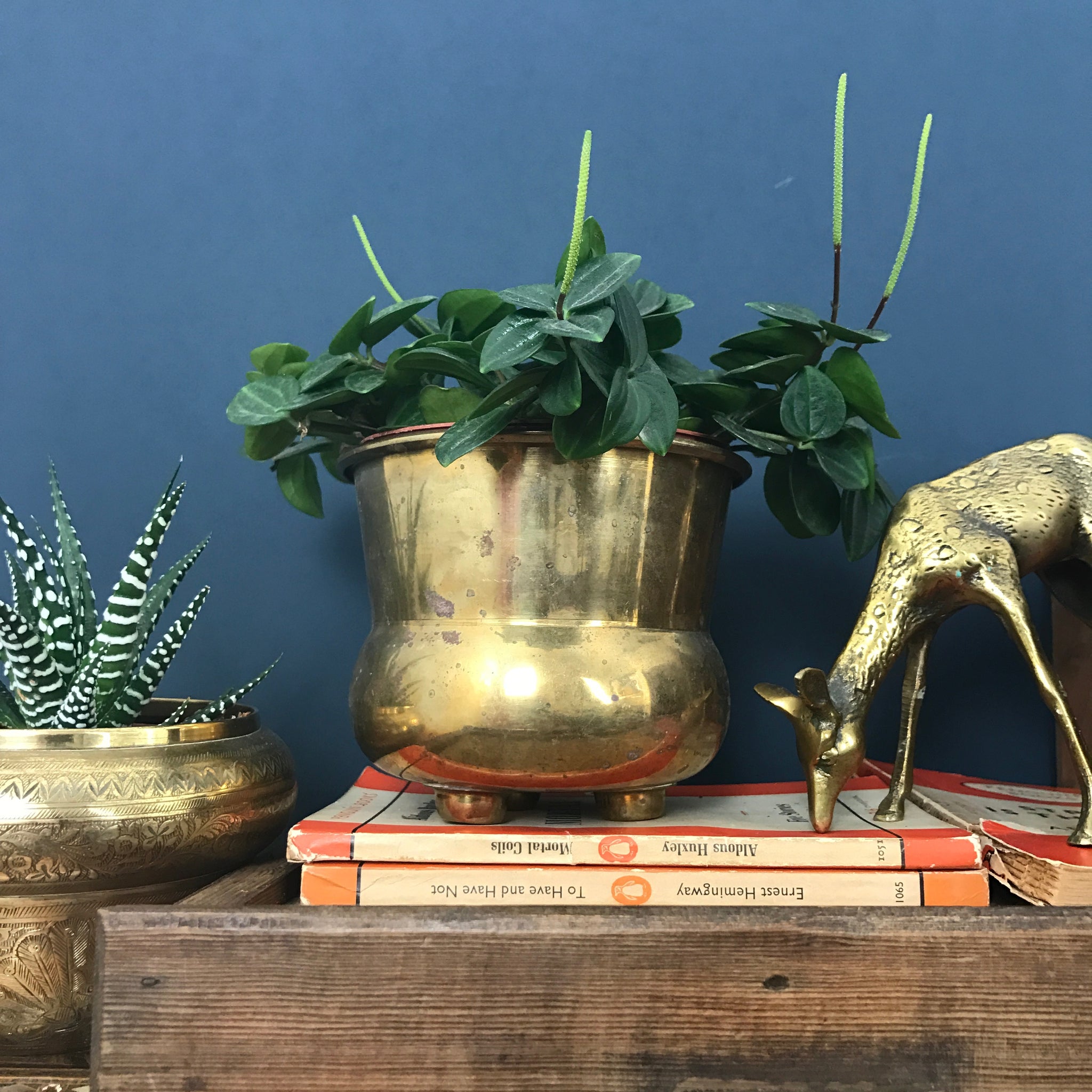A vintage brass planter featuring three brass feet. In excellent vintage condition with lovely patina that only age can achieve.